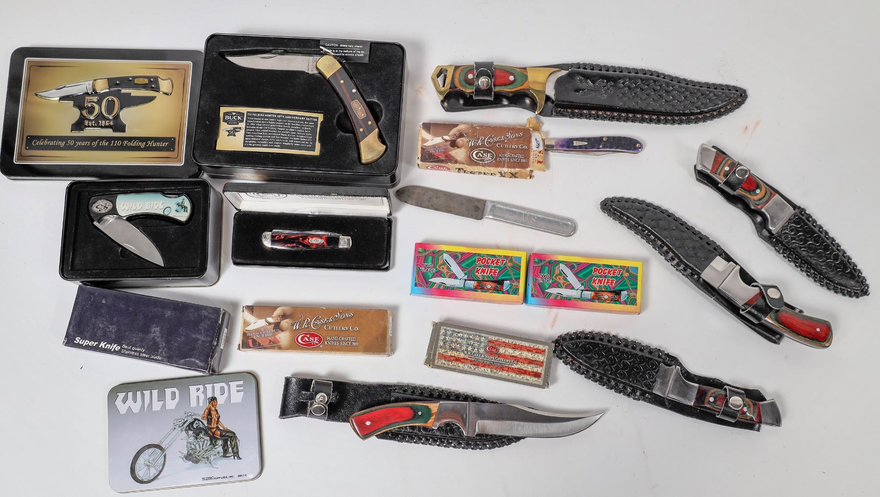12 knives. 2x 6" bone handle folding, NIB. EDC 8" folding NIB. Case 8" folding NIB. Aluminum handle U.S. L.F.& C. 1917 military table knife 7.25". Wild Ride motorcycle 7" folding in case. Buck 110 folding Hunter 50th Anniversary edition, ebony handle, 8.75" new in case. 5 unmarked multi color wood handle knives with sheaths-8" light rust spots, 8.25" light rust spots 9.5", 9.75", 12.25". W R Case 6.25" 2 blade folding in case. W R Case purple handle folding 7.25" in collapsed original box. W R Case orange handle folding XX in box 6.5".