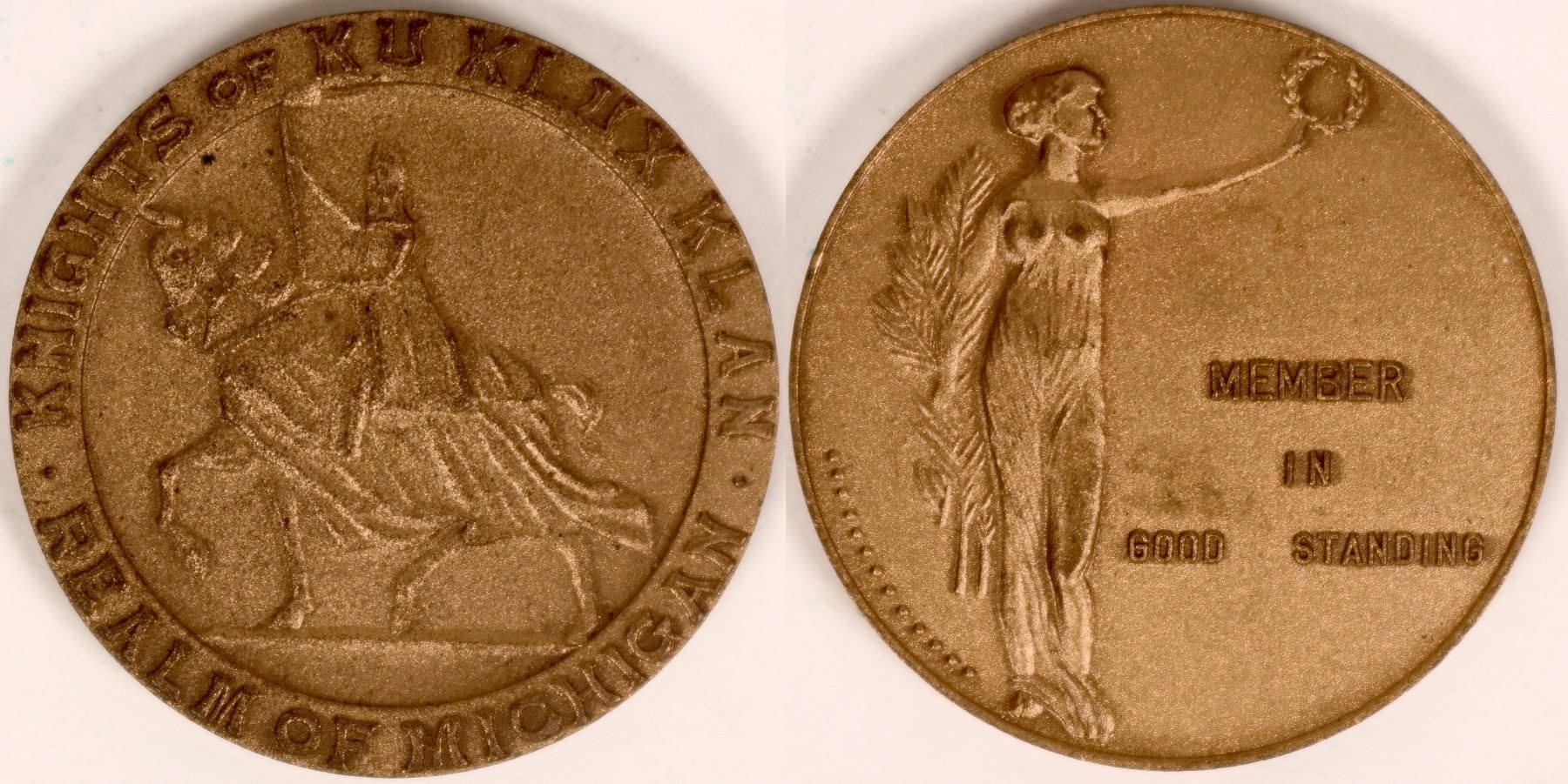 Obv.: Knights of Ku Klux Klan / (horse and hooded rider) / Realm of Michigan; Rev.: Member / In / Good Standing.Br. rd., 32 mm.