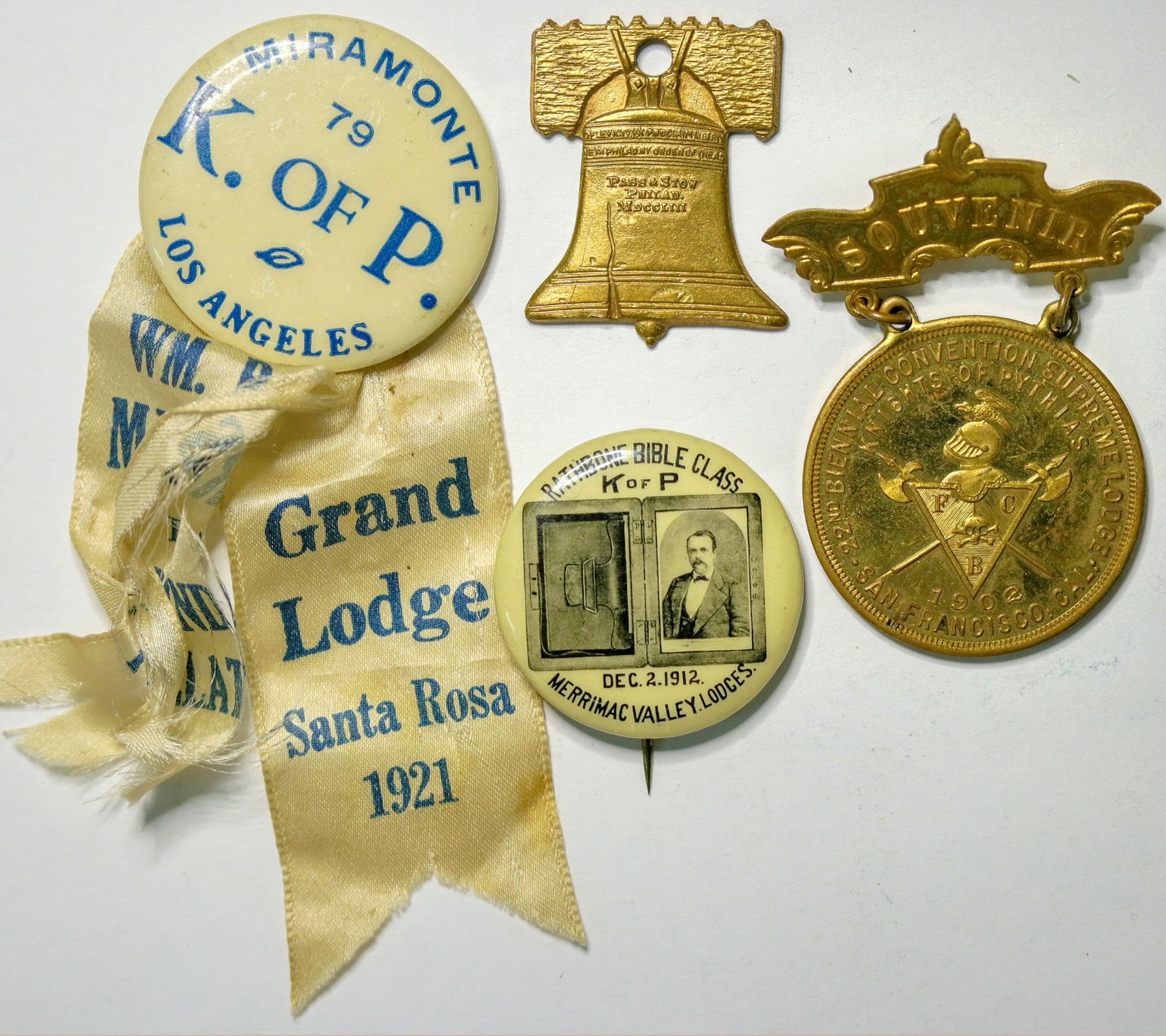 Lot of three pieces: 1921 button with ribbon from Santa Rosa Lodge; Souvenir from the 1902 Biannual Convention in San Francisco; 1912 Merrimac Valley Lodges pin back.