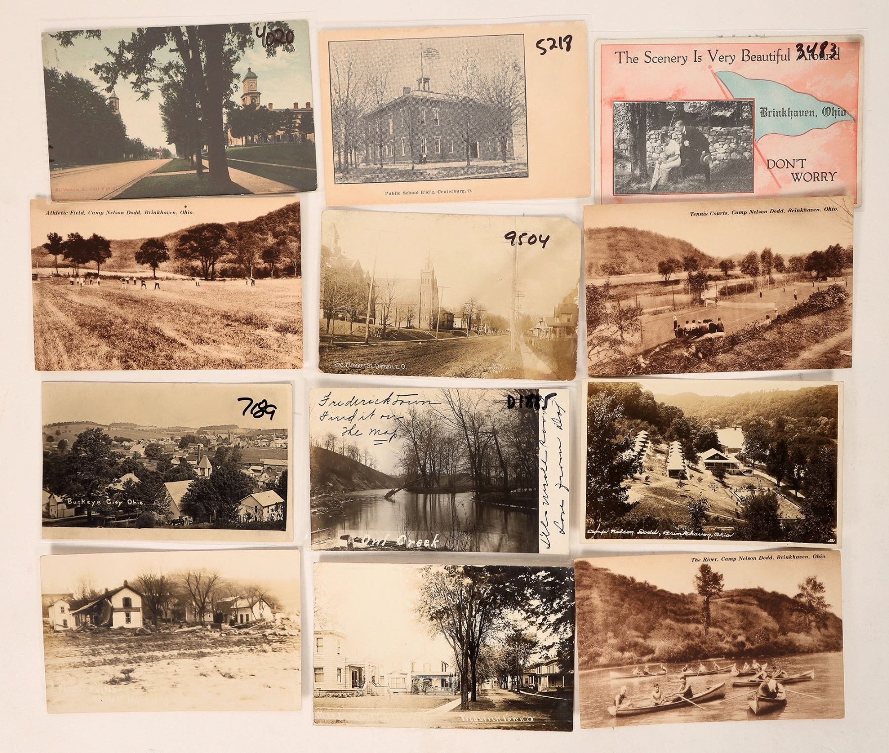 A dozen postcards from Knox County, Ohio, c1907-31. Towns include Brinkhaven, Fredericktown, Buckeye City, Centerburg. Flood, scenic, streets, buildings, Birdseye view, Camp Nelson. Some RPCs.[ Brinkhaven, Knox Co. Ohio
