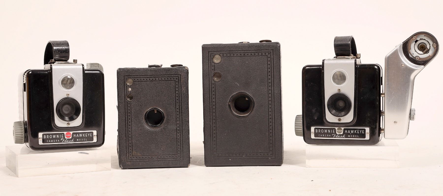 4 different Kodak Brownies. 2a Hawkeye Special. #2 Hawkeye Special. Flash Model with flash and another w/o flash in mostly intact original box.