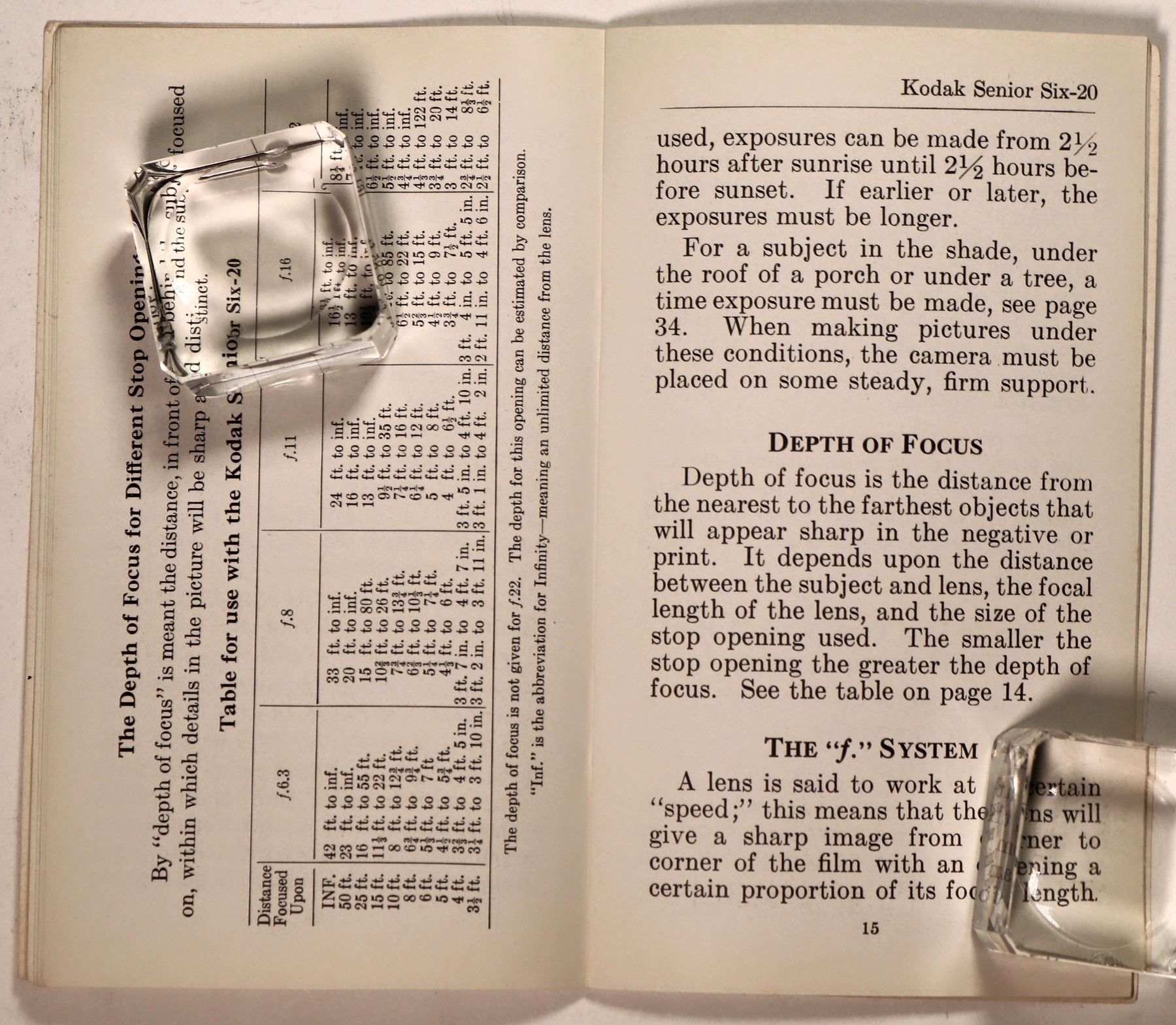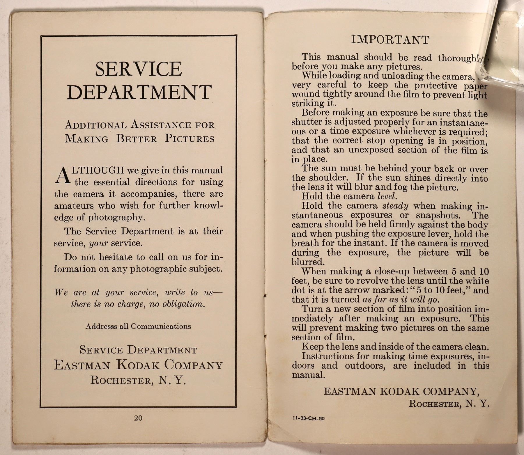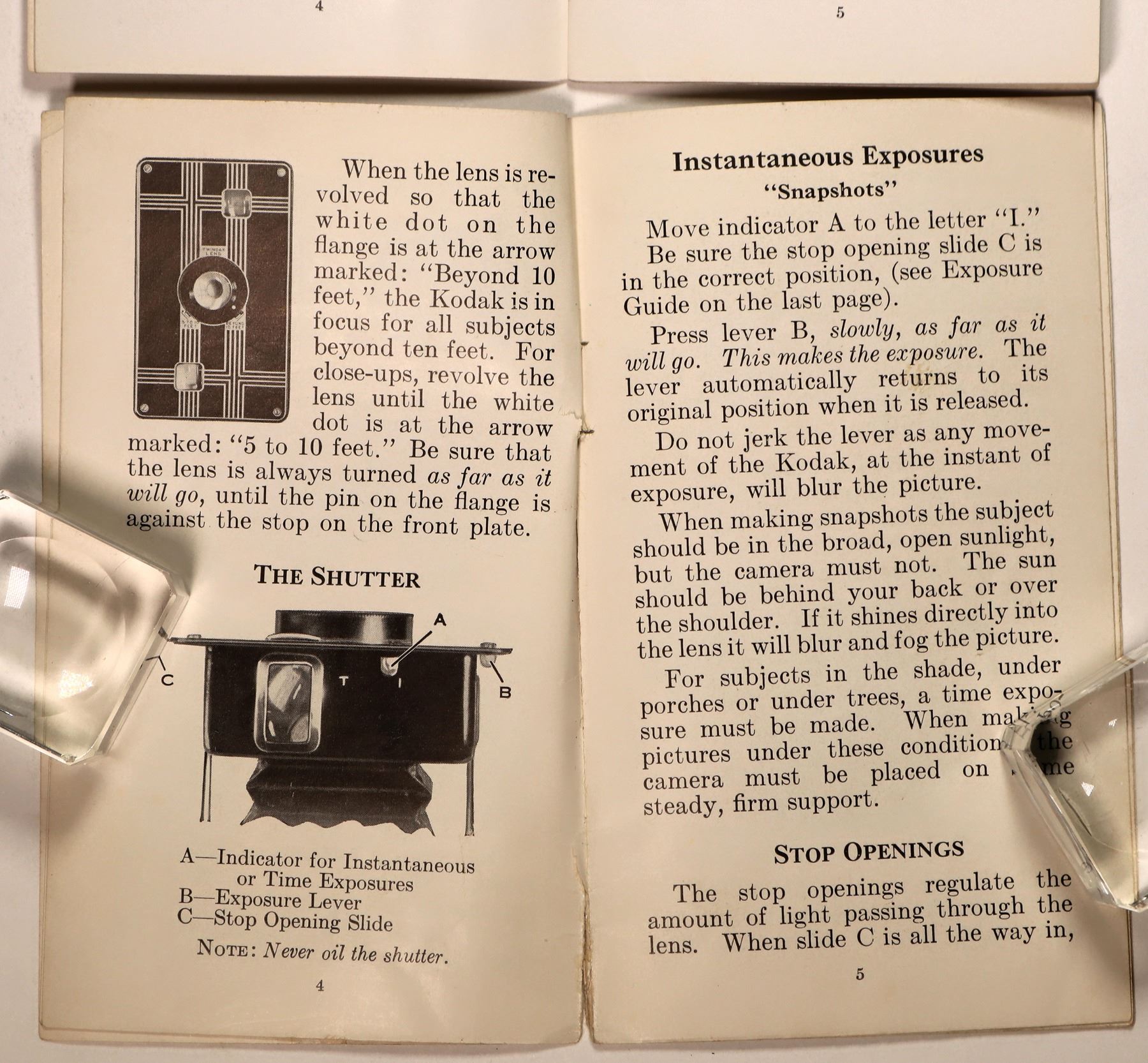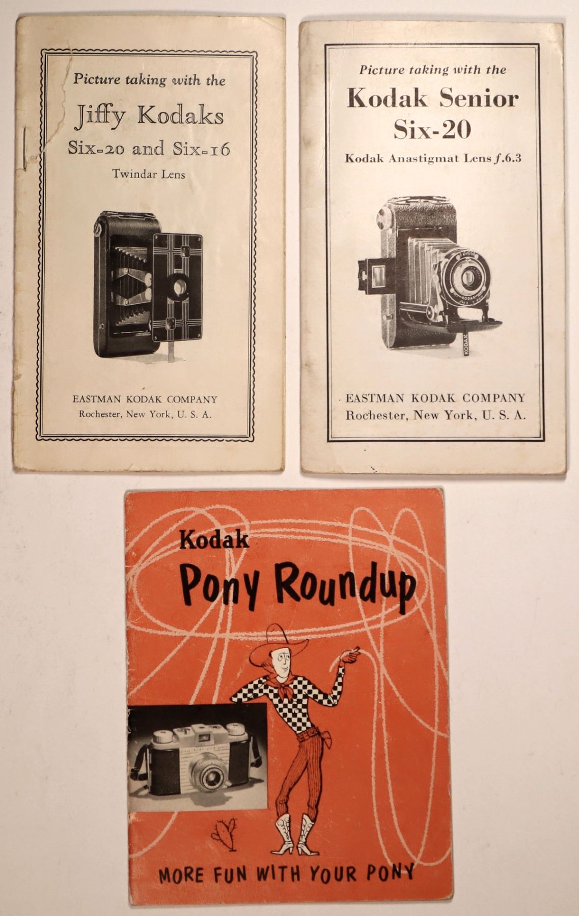 A trio of early Eastman Kodak Company manuals/booklets for box and expanding camera models, c1930s-50s. Includes: Picture taking with the Kodak Senior Six-20 Kodak Anastigmat lens f.6.3, 36 pp.; Picture taking with the Jiffy Kodaks Six-20 and Six-16 Twindar Lens, 20 pp.; Kodak Pony Roundup, 15 pp. "More fun with your Pony" on front.[