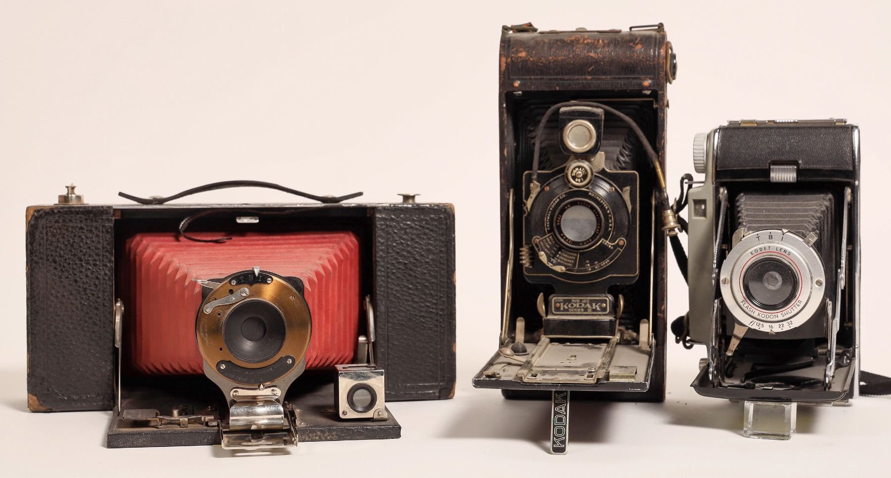 Kodak 2c with split leather strap. Tourist #2. 3a folding Brownie. Not tested.