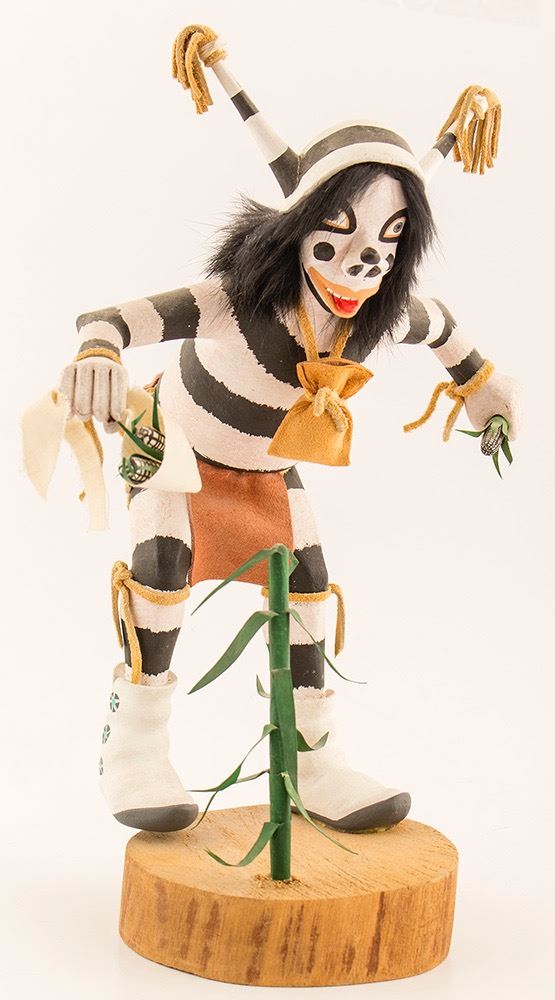 Koshare by Clarence Cleveland. This charming clown is gathering corn. 12.2" x 8.25" x 7". Clarence Cleveland married Sadie Laban (Hopi) - as a Navajo he would not traditionally carve kachina figures, but was given special permission through his marriage by the clan which allowed him to carve clowns only. He has been an active carver since the 1970's. He uses other materials than wood to create the tassels tied to his wrists and calves - as well as the fringe atop his cap, and the leather bag around his neck. He also uses rabbit fur to recreate the "hair" of the clown. Date: Location: Hopi, Arizona HWAC # 52140