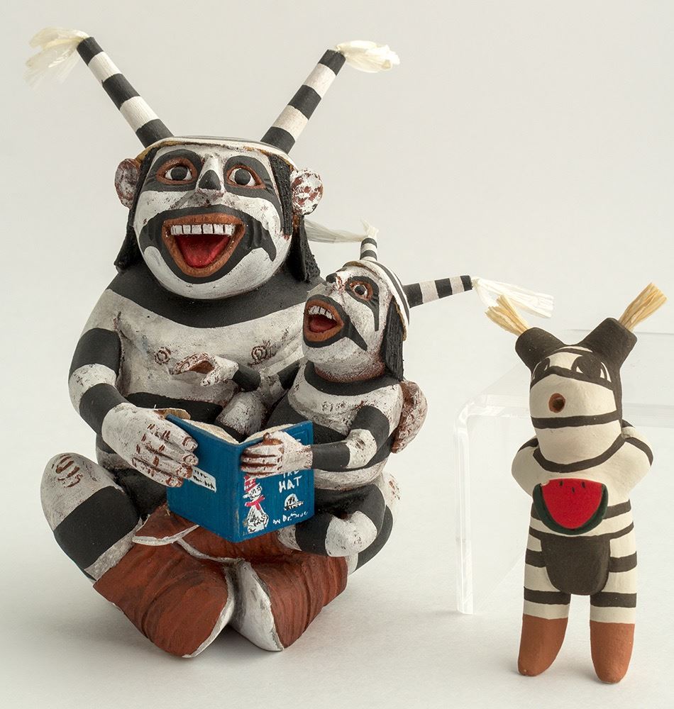 Koshare (clown) by Loren David. Two figures, father reading "The Cat In the Hat" to son. 6.75" x 4" x 4.25'. Loren is the son of well-known Hopi artist, Neil David Sr.. Like his father, he has an affinity for the clowns of the plaza. His work is rapidly improving, and his carvings increasingly depict multiple figure characters. Also included is ceramic Koshare, artist unknown, 4" h. State:Arizona City:Hopi Date: ID# 49356
