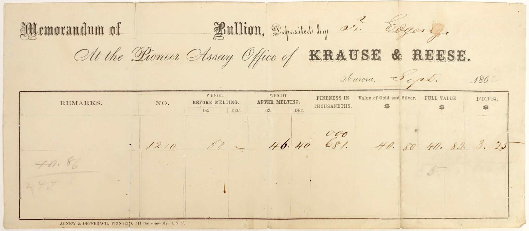 Krause & Reese Pioneer Assay Office Memorandum, Aurora, Nevada Territory, 1862 [199034]