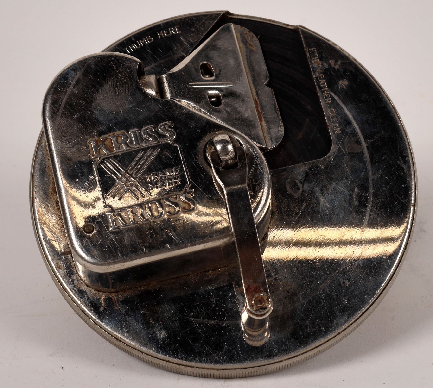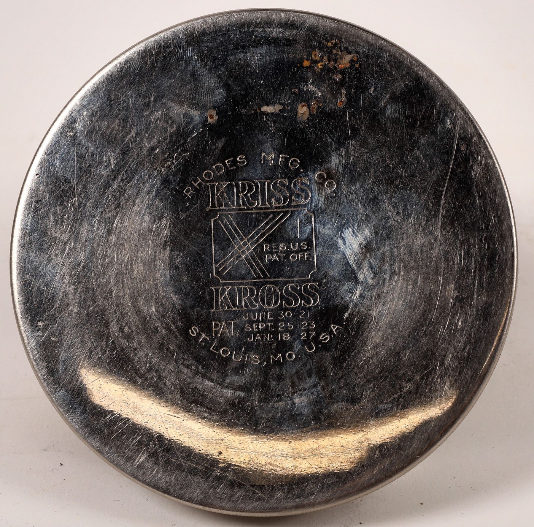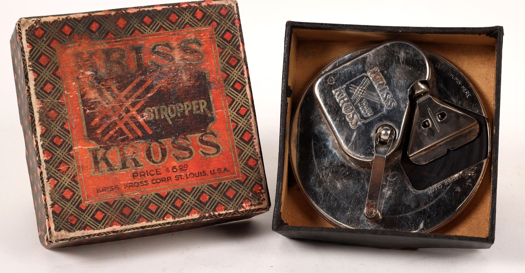 This is a mechanical razor sharpener made by the Kriss Kross Corp. in the original box. C. 1920's. The hand crank spins a stropping wheel while the razor flips to sharpen the other side. In working order.