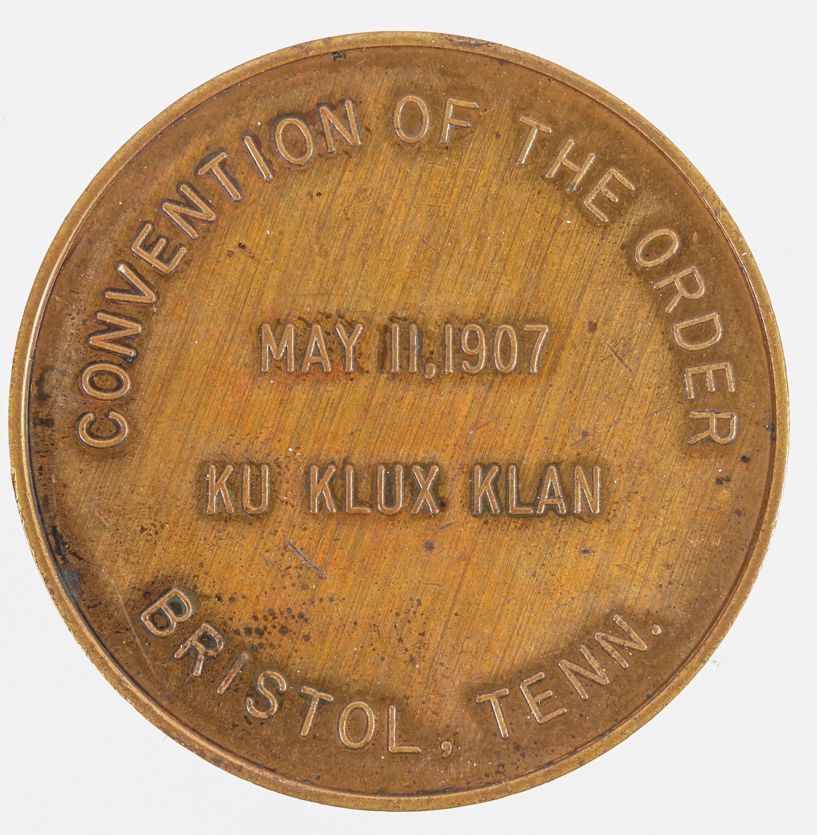 Bronze medal noting the 1907 Convention of the Ku Klux Klan in Bristol, Tennessee. ~38mm diameter. Listed in Birdsell catalog page 6 as KK-104.