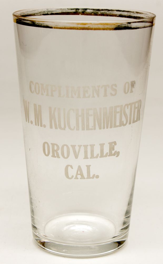 Possibly the only known Oroville glass known. "Compliments of / W. M. Kuchenmeister / Oroville / Cal." Etched. Gilt edged. 4". Burt Collection