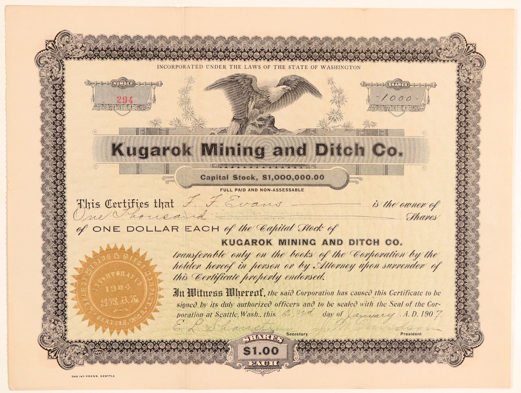 # 294 for 1000 shares to FF Evans. Signed by EL Shanstrom and president JM Davidson. Dateline Seattle 11907. Incorporated 1904. Eagle vignette. Ives Press was the printer. Heavy folds and small dog ears. Nice! Located in the Kugarok Mining Dist., Nome Borough, Alaska. JM Davison (president) was the organizer of this 13 mile ditch project. Ken Prag Collection