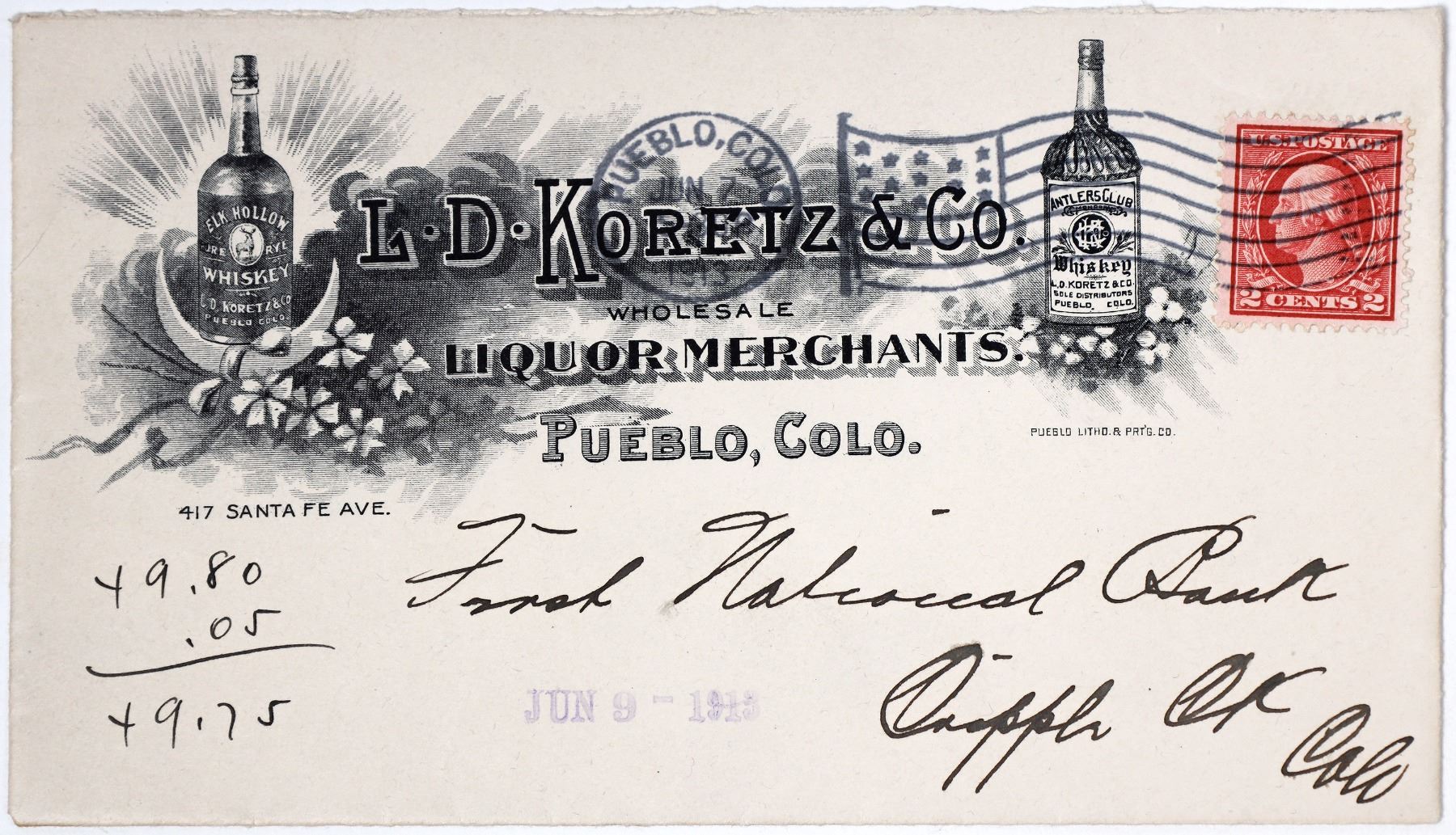 Fantastic cover for L.D. Koretz & Co., wholesale liquor merchants in Pueblo. Vignette shows two different paper label whiskey bottles. Sent to the First National Bank in Cripple Creek, 1913.