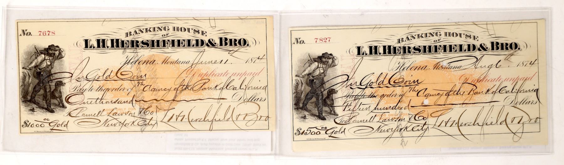 Two bank checks made payable "In Gold Coin". Helena, Montana. Banking House of L. H. Hershfield & Co. draft payable in Gold Coin. black on white. Printed by R. F. Macoy, New York. Miner and dog. Used, VF. Helena Montana