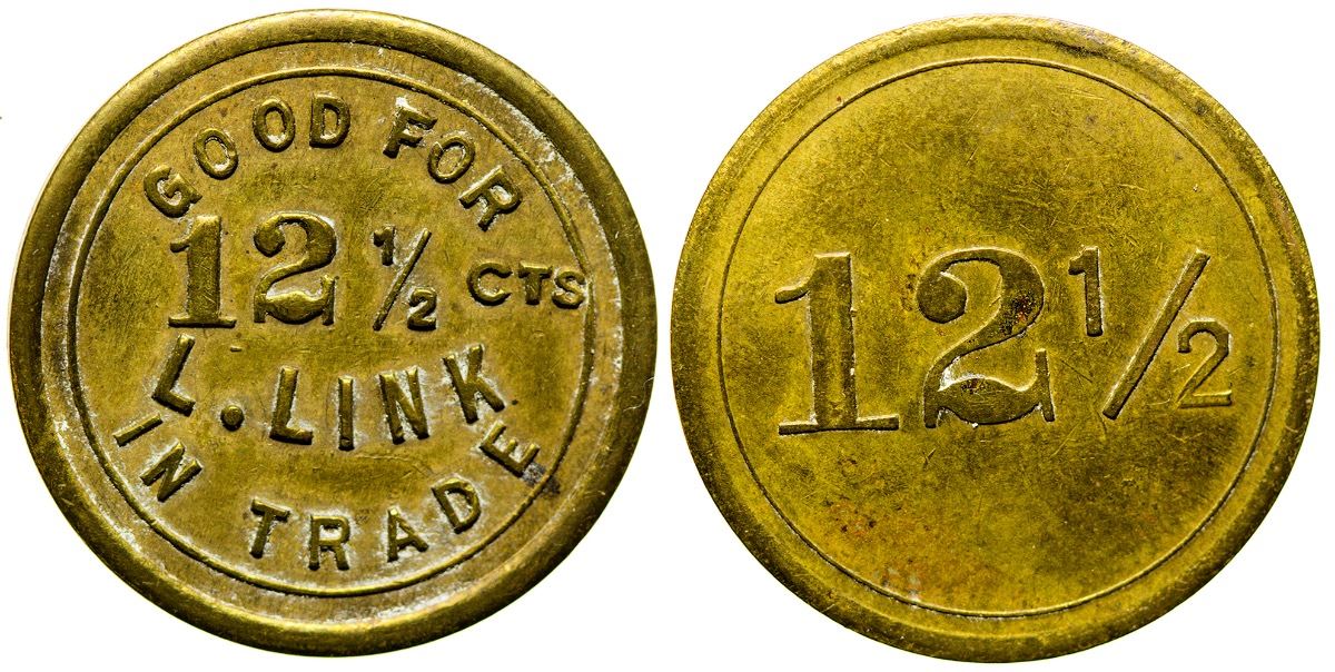 R-8. GF / 12 1/2c / L. Link / IT // 12 1/2. Round, brass, 24mm. (Svoboda Collection) City: Garnet State: Montana Date: HWAC# 35320