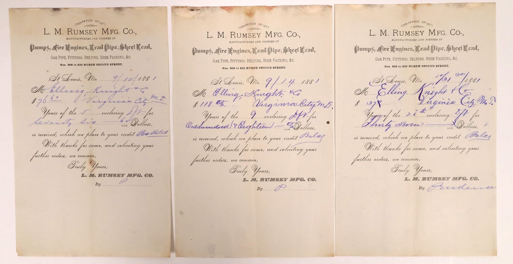 3 receipts, 1881, from L M Rumsey Mfg. Co, St. Louis, manufacturer of pumps, fire engines, lead pipe, sheet lead. Sold to Elling, Knight & Co. Virginia City, M.T. 9.5x6".