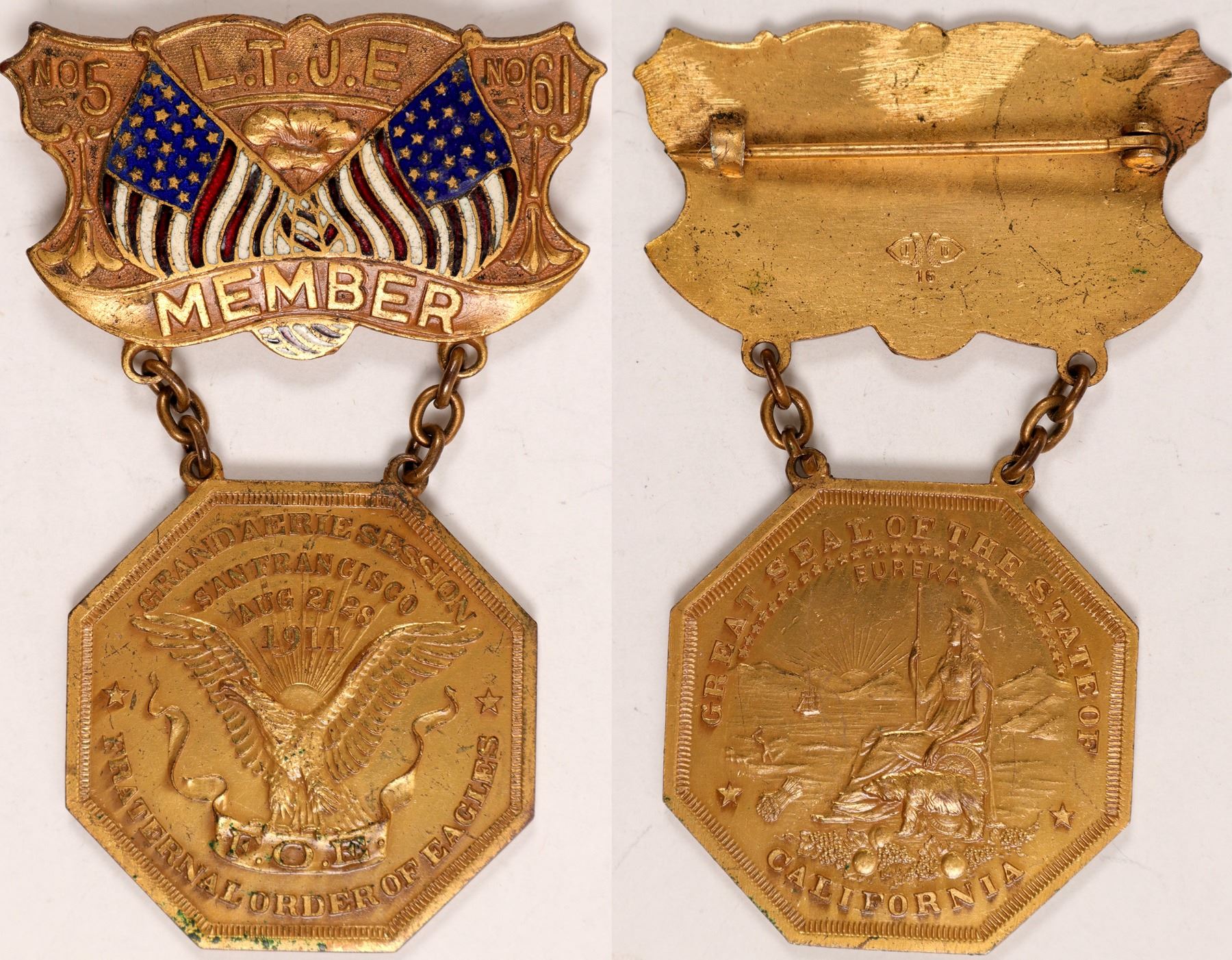 Hanger type. Pinback has crossed American Flags, hanger is modeled after $50 Slug. Pictorial of Eagle. 80mm long.