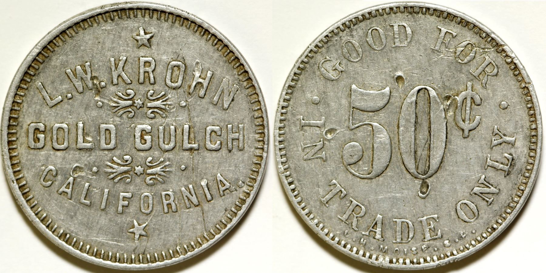 Rare. Obv.: L. W. Krohn / Gold Gulch / California; Rev.: Good For / 50c / In Trade Only. Wm, rd., 28 mm. Daniel Manassillian Collection. State: California City: Gold Gulch Date: HWAC# 84366