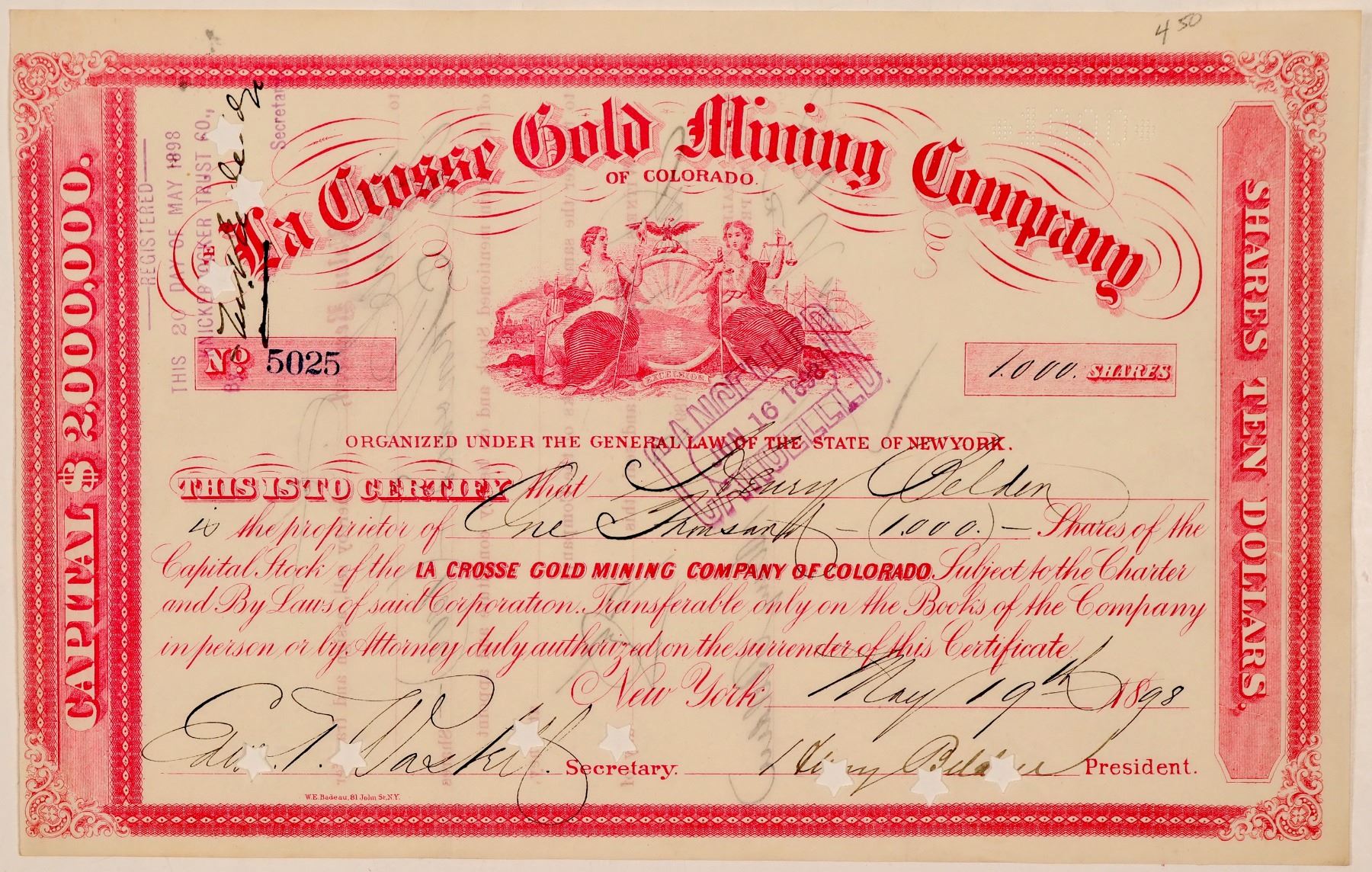 Incorp. June 1859 New York. #5025. Cancelled.. Signed by president Frank R. Van Ness. 2) Printed in pink. Vignette state seal. W.E. Badeau printer. This mine produced gold & silver averaging 2 to 6 ounces per ton of ore. It was located in Gilpin County, Central City, Black Hawk Mining District, Colorado - at Quartz Hill. The claim was known as the Burroughs Lode.