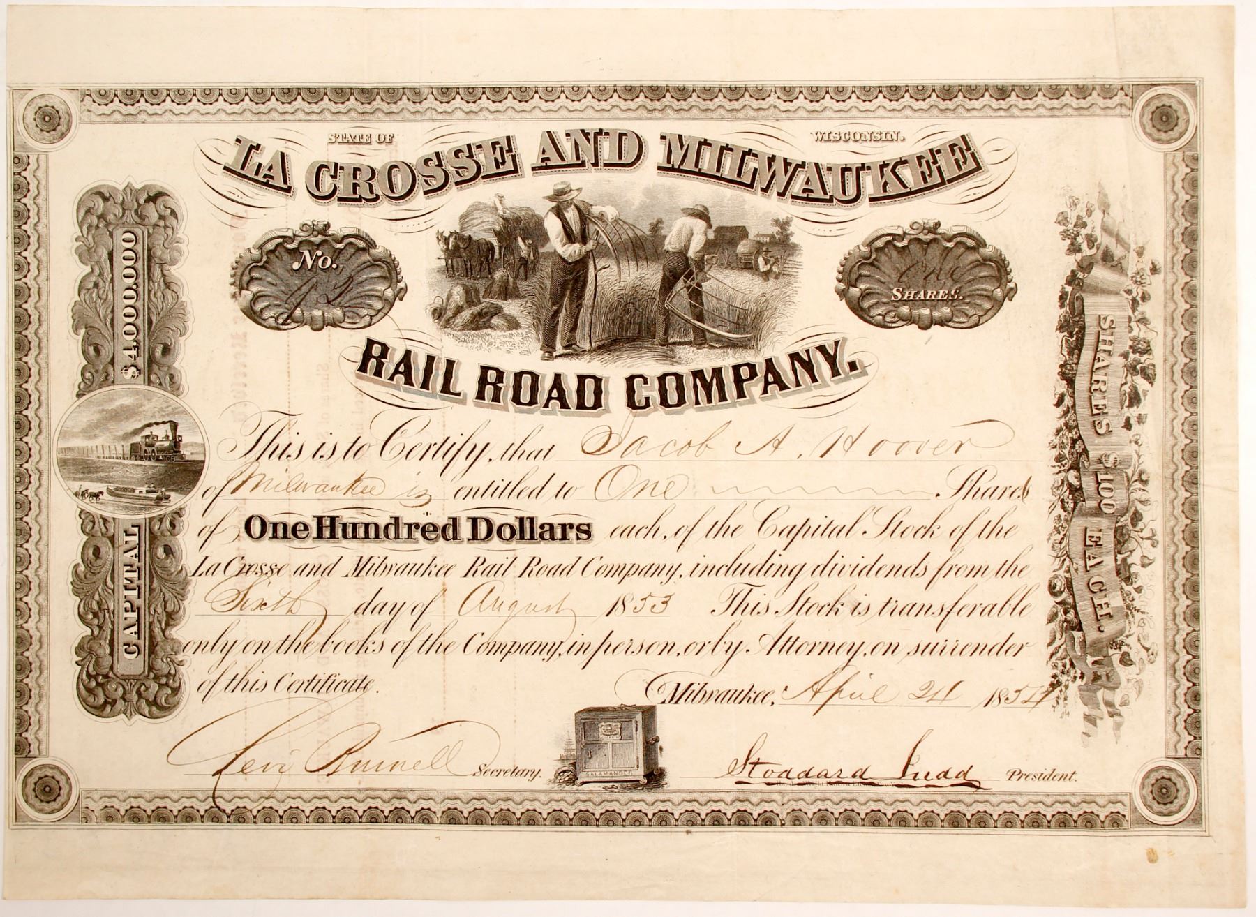 I/U #92 Jacob Hoover 1 share 1854 signed by President illegible. Farmers with wheat vignette. Prag Collection