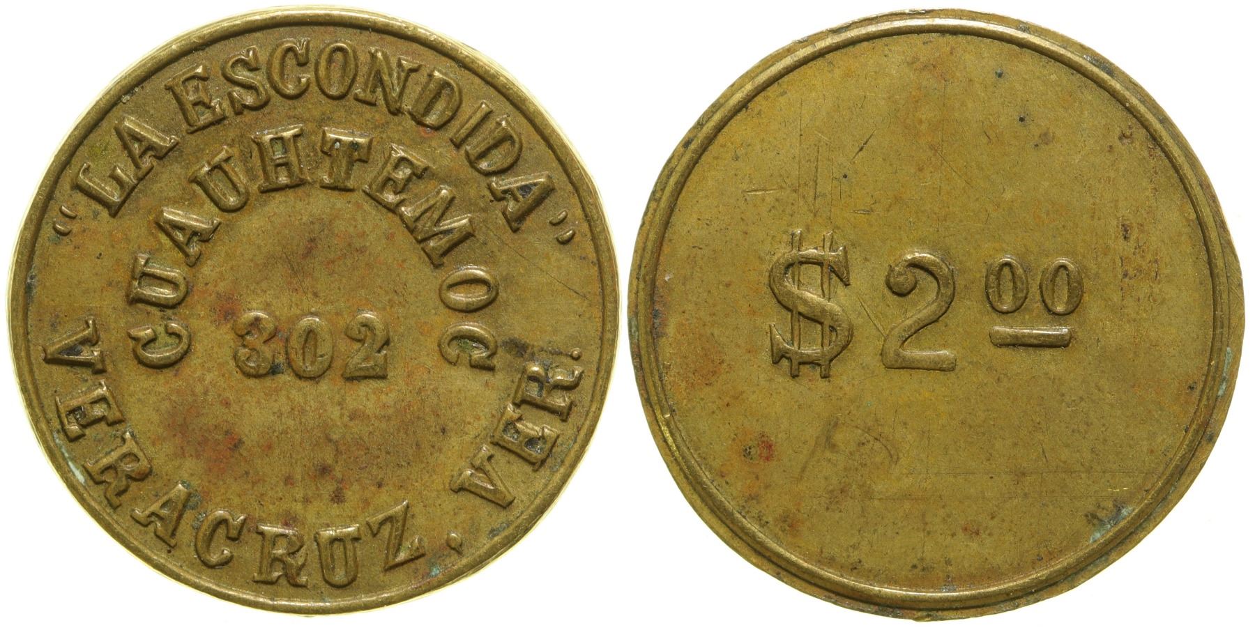 Obv.: La Escondida / Cuauhtemoc / 302 / Veracruz, Ver.; Rev. : $2.00. Br., rd., 20 mm.