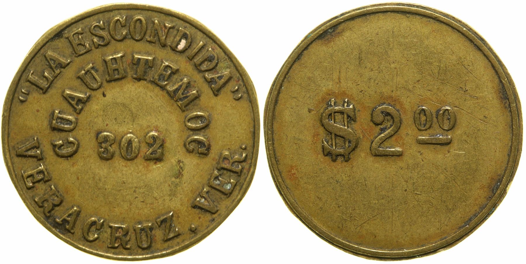 Obv.: "La Escondida" / Cuauhtemoc / 302 / Veracruz, Ver.; Rev.: $2.00. Br. rd., 21 mm.