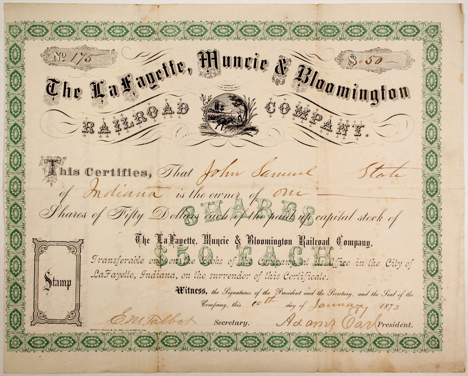 Unlisted in 1st edition. I/U #175 John Samuel 1 share 1873 signed by President Earl. Fair condition. Prag Collection. State: City: Date: 1873 HWAC# 84976