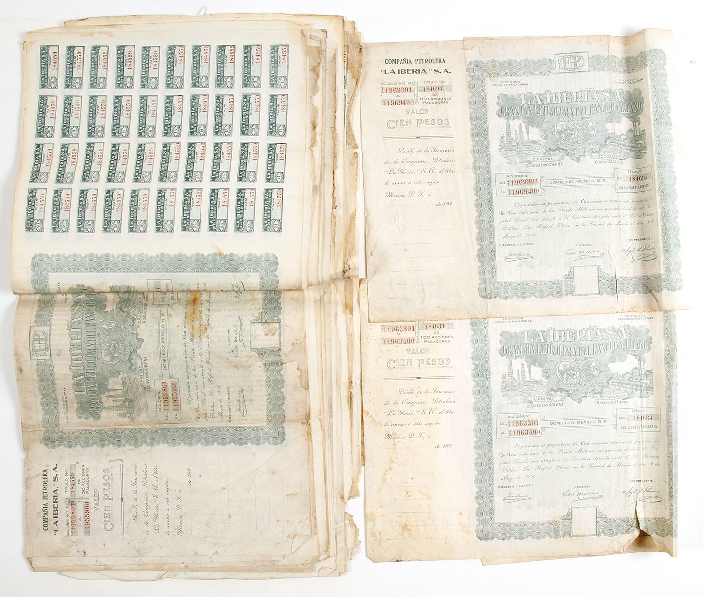 Approx 30 La Iberia. SA Gran Cia Petroera Del Panugoy y Ebano unissued bonds. Stains and foxing, please inspect. Date: 1916 Location: Mexico HWAC# 69021