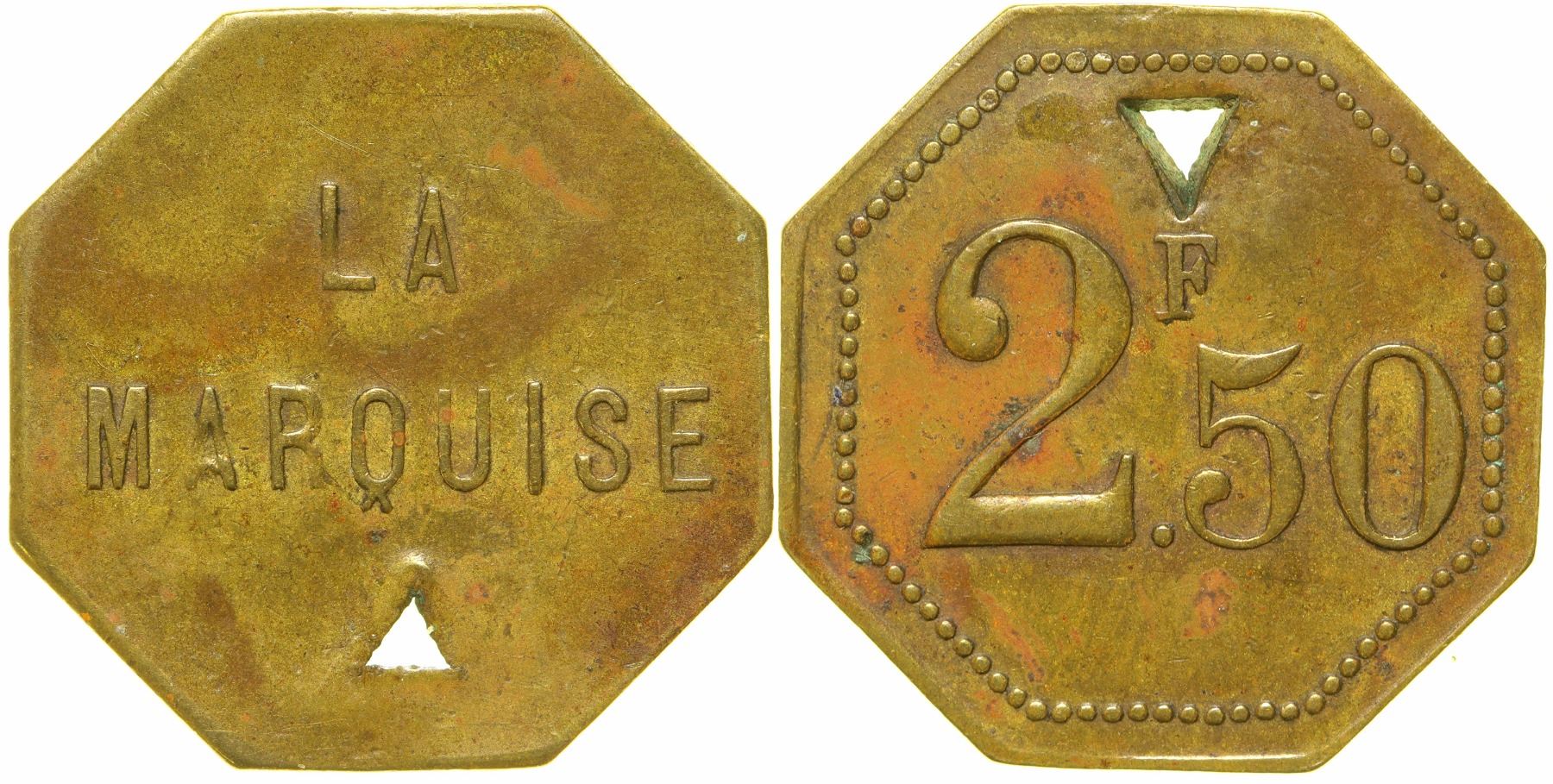 Obv.: La / Marquise; Rev.: 2.50 F. Br. octogonal, 27 mm, triangle cut out.