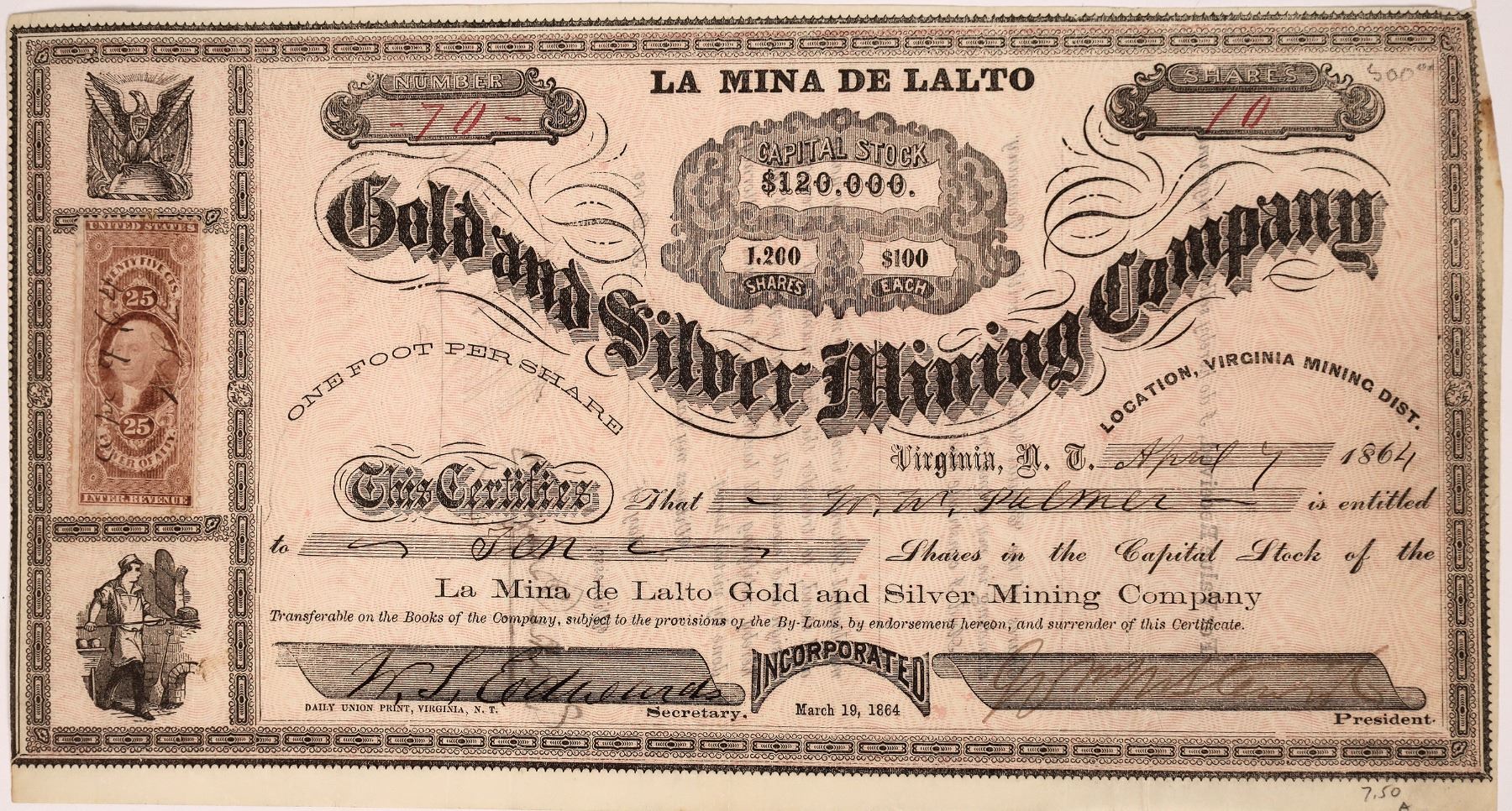 La Mina De Lalto - Virginia Mining District, Virginia, N.T. - Stock Certificate No. 70 for 10 shares made out to W. W. Palmer datelined April 7, 1864. The Company was capitalized at $120,000; 1200 shares at $100 each and incorporated in Virginia, Nevada on March 19, 1864. Has printed on certificate 'one foot per share'. Signed by W. Wosted, President and W. L. Edwards, Secretary. Printed by Union Print, Virginia, N. T. Two small vignettes on left: one an eagle and another a man loading an oven. Red- brown, 25-cent Power of Attorney Internal Revenue stamp at left. Fine condition. Reference: La Mina De Lalto Gold & Silver Mining Co. Certificate of Incorporation Date: 1864 03 19 in box # TERR-0081 file # 10; Nevada Territory Secretary of the Territory Records of Corporations http://nevadaculture.org/nsla/dmdocuments/secretary_territory.pdf