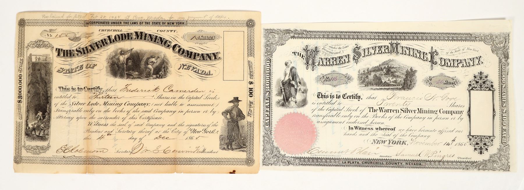 Lot of 2 different. 1) Warren Silver Mining Company. Issued 1865, not cancelled. Mining and allegorical vignettes. Clean. This company operated at La Plata, about thirty miles east of Fallon, which was at that time the county Seat of Churchill County. The name of the town is derived from the Spanish word for silver. 2) The Silver Lode Mining Company. Issued in 1865. Three mining vignettes. Folds, toning, separation with tape repairs. Operated at La Plata, Churchill County.