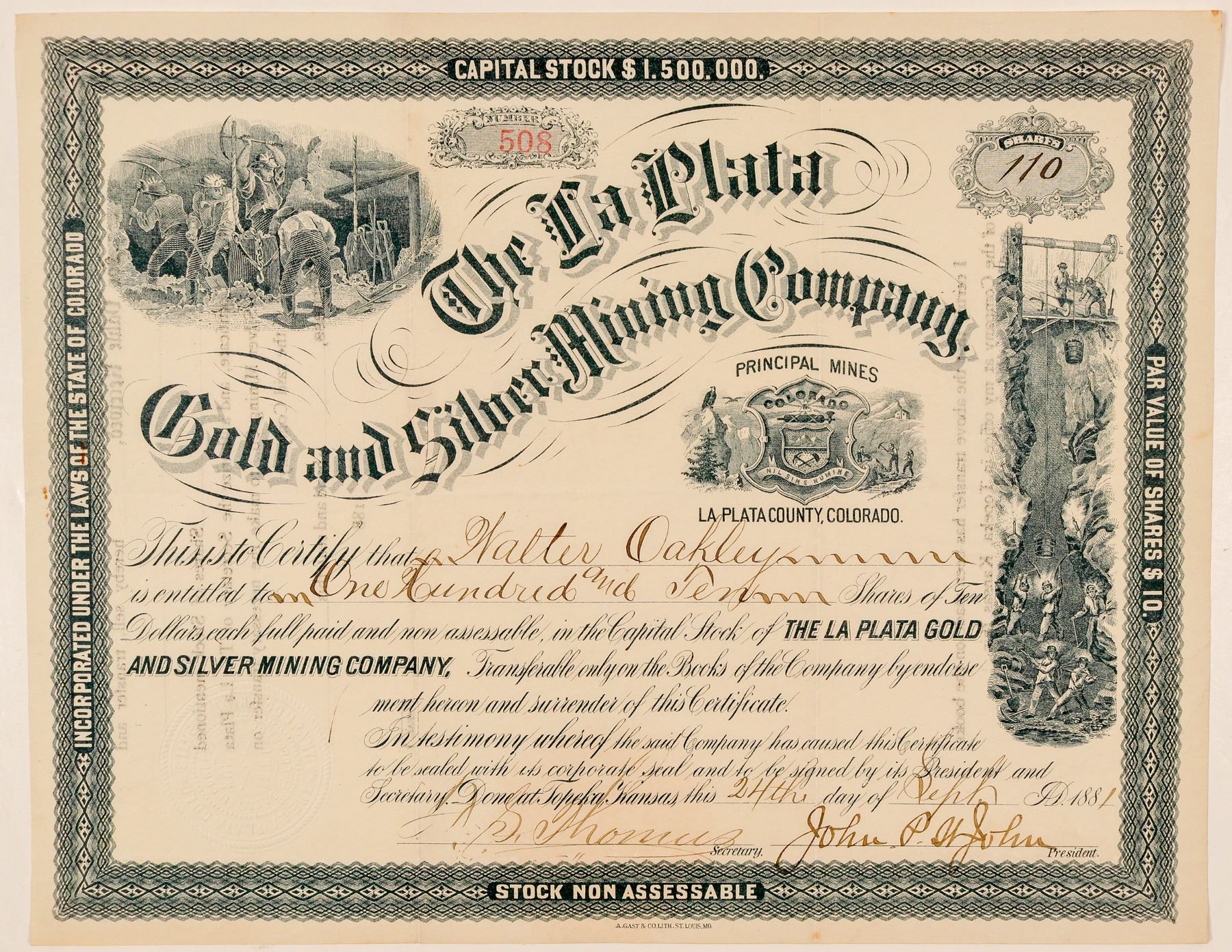 Principal Mines, La Plata County, Colorado (printed under title). Inc. in Colorado. No. 508, issued for 110 shares to Walter Oakley on Sept. 24th, 1881. Signed by president John P. St. John and secretary F.S. Thomas. Not cancelled. Black border and print. Three vignettes: miners filling ore bucket (upper left), state seal (center), and mine hoisting scene (right side). Printed by A. Gast & Co., St. Louis. Folds. 8.25 x 10.25" From an 1881 prospectus for the company: "The property of this Company consists of seven gold and silver bearing mining lodes, situated in the Kennebeck and Heffernan Gulches, at the heads of the La Plata River and Junction Creek, upon Cumberland Peak, one of the most prominent of the lofty La Plata Mountains, and being in the exceedingly rich and recently discovered mineral territory, known as the Junction Creek Mining District, the unusual richness of which in both gold and silver is creating so much excitement in Southwestern Colorado." Located in 1880. The seven claims include: Bunker Hill, Fort Schuyler, R.F. Abbott, Port Henry, W.F. White, Brooklyn, and Adirondack. () Ken Prag Collection