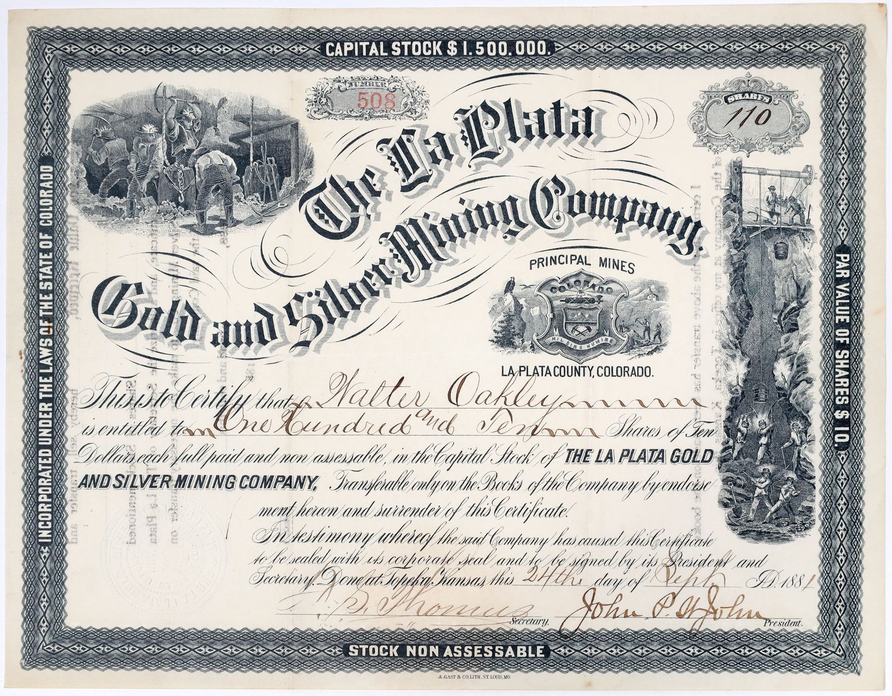 Extremely rare. "Principal Mines, La Plata County, Colorado" (printed under title). Inc. in Colorado. No. 508, issued for 110 shares to Walter Oakley on Sept. 24th, 1881. Signed by president John P. St. John and secretary F.S. Thomas. Not cancelled. Black border and print. Three vignettes: miners filling ore bucket (upper left), state seal (center), and mine hoisting scene (right side). Printed by A. Gast & Co., St. Louis. Folds. 8.25 x 10.25" From an 1881 prospectus for the company: "The property of this Company consists of seven gold and silver bearing mining lodes, situated in the Kennebeck and Heffernan Gulches, at the heads of the La Plata River and Junction Creek, upon Cumberland Peak, one of the most prominent of the lofty La Plata Mountains, and being in the exceedingly rich and recently discovered mineral territory, known as the Junction Creek Mining District, the unusual richness of which in both gold and silver is creating so much excitement in Southwestern Colorado." Located in 1880. The seven claims include: Bunker Hill, Fort Schuyler, R.F. Abbott, Port Henry, W.F. White, Brooklyn, and Adirondack.