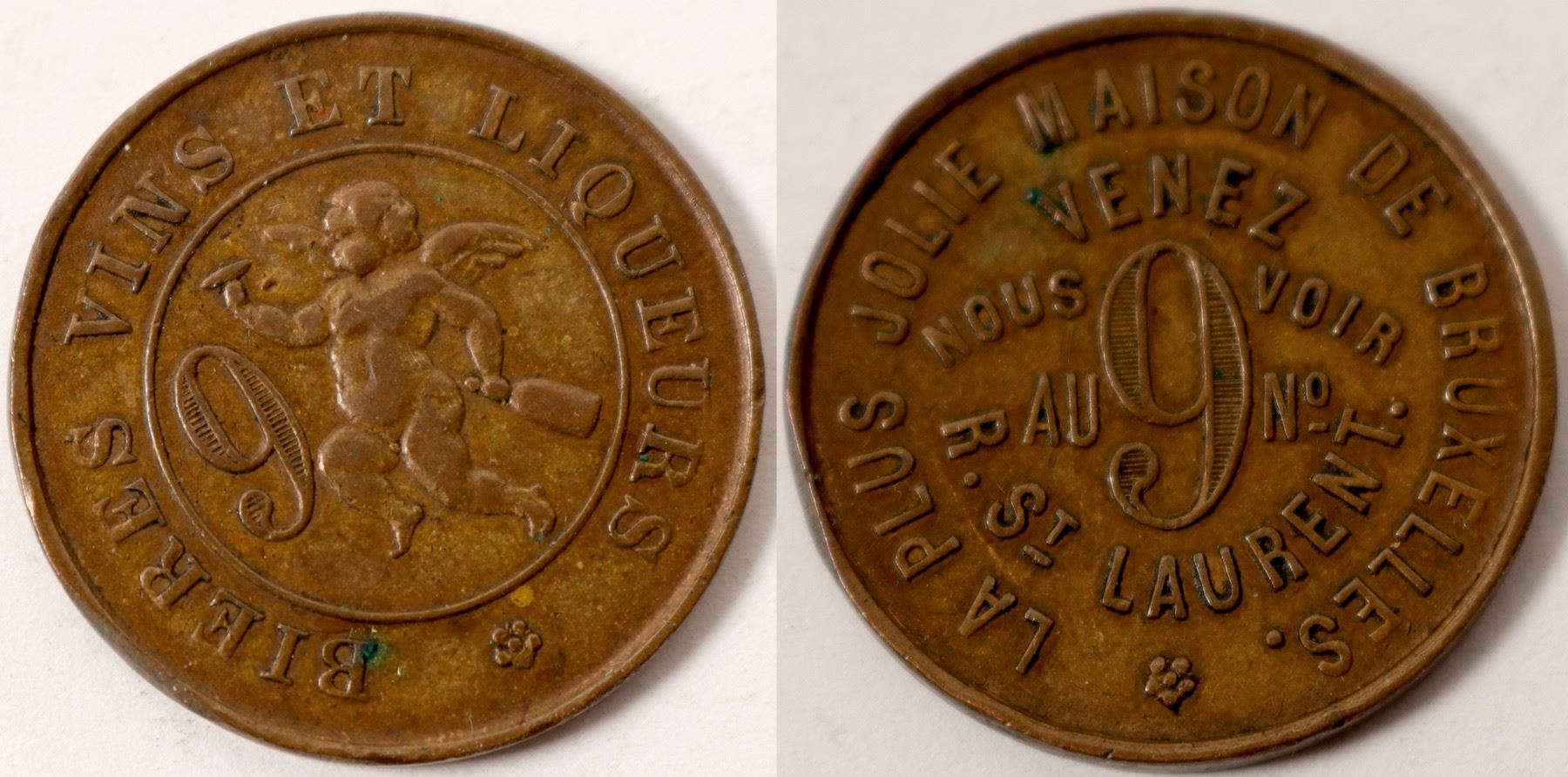 Obv.: La Plus Jolie Maison De Bruxelles / Venez / Nouse Voie /Au 9 No. /R. St. Laurent. Rev.: Bieres Vins Et Liqueurs / 9 / (pictorial cherub). Br., rd., 23 mm.