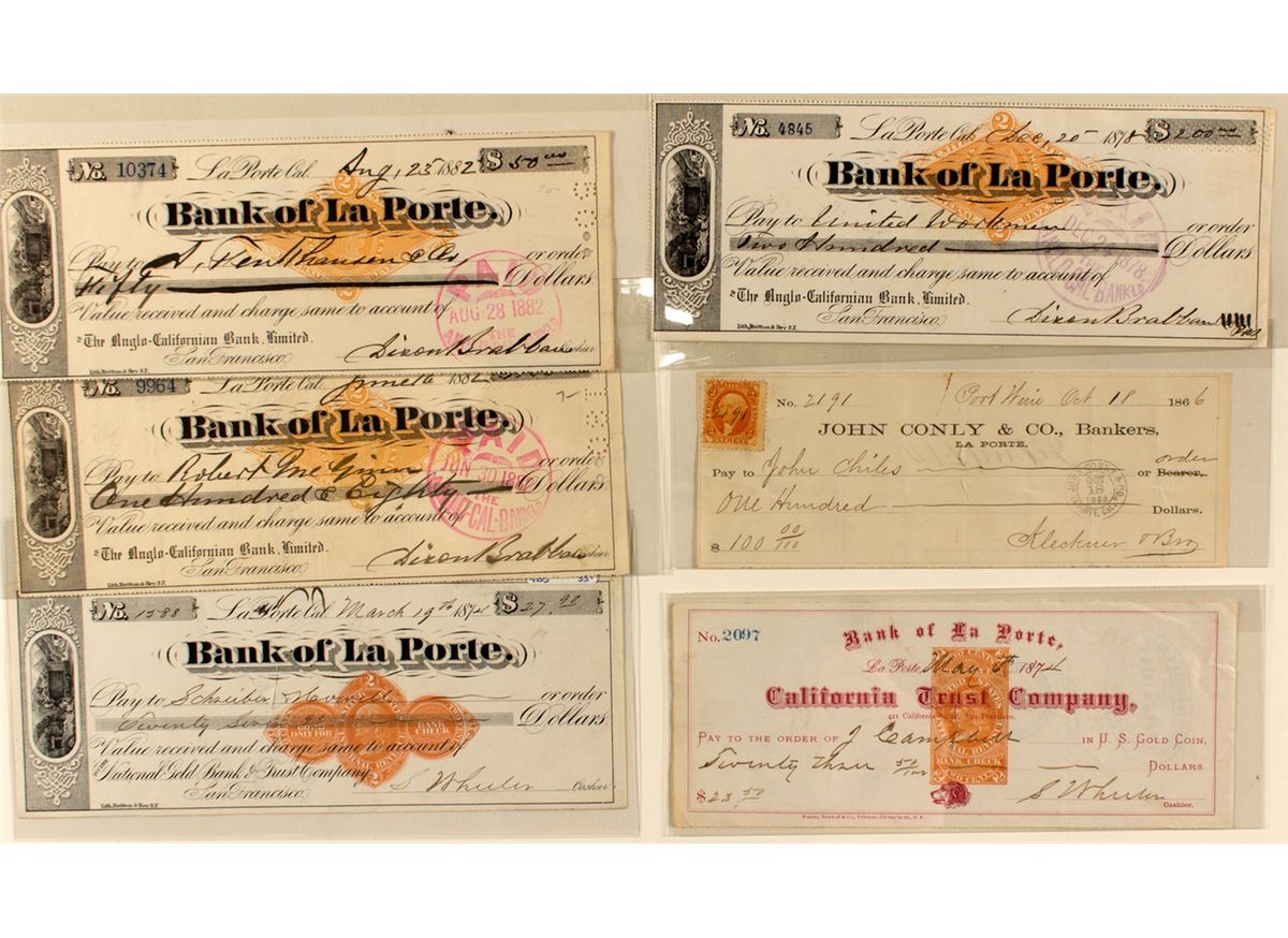 Lot of six. 1) John Conly & Co., Bankers. Oct. 18, 1866. US IR revenue stamp. 2) Four Bank of La Porte checks w/ mining vignette and RN-D1 imprint. 3) Bank of La Porte, California Trust Company. Red font and vignette of dog. RN-E7.
