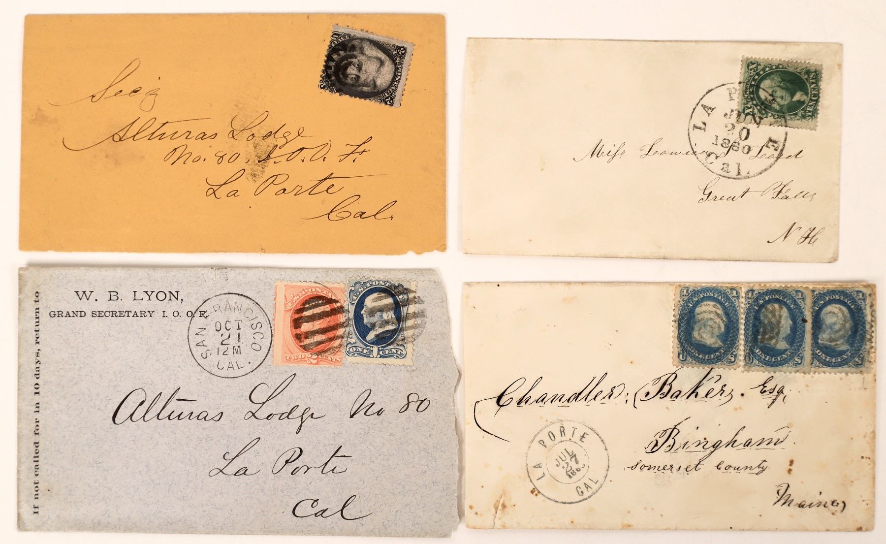 Group of four covers from La Porte CA. with stamps. Included are covers with Two cent black Jackson, an 1868 10 cent, Washington green, 1890 one cent Ben Franklin (3), 1890 two cent Lincoln orange and an 1890 one cent Franklin blue.