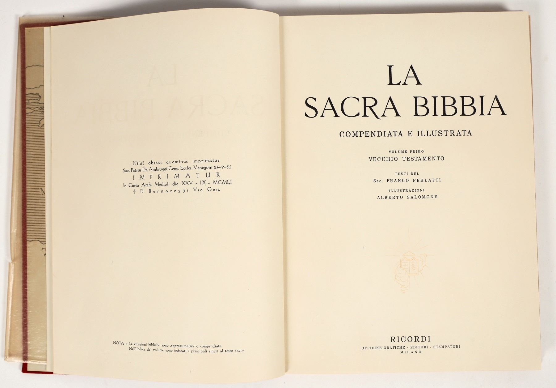 La Sacra Bibbia, abridged and illustrated, Ricordi publisher. 203 pages, hardcover , Old Testament, starting w/Genisis. . In new condition w/ original shipping holder. Illustrations are spectacular. Written in Italian.