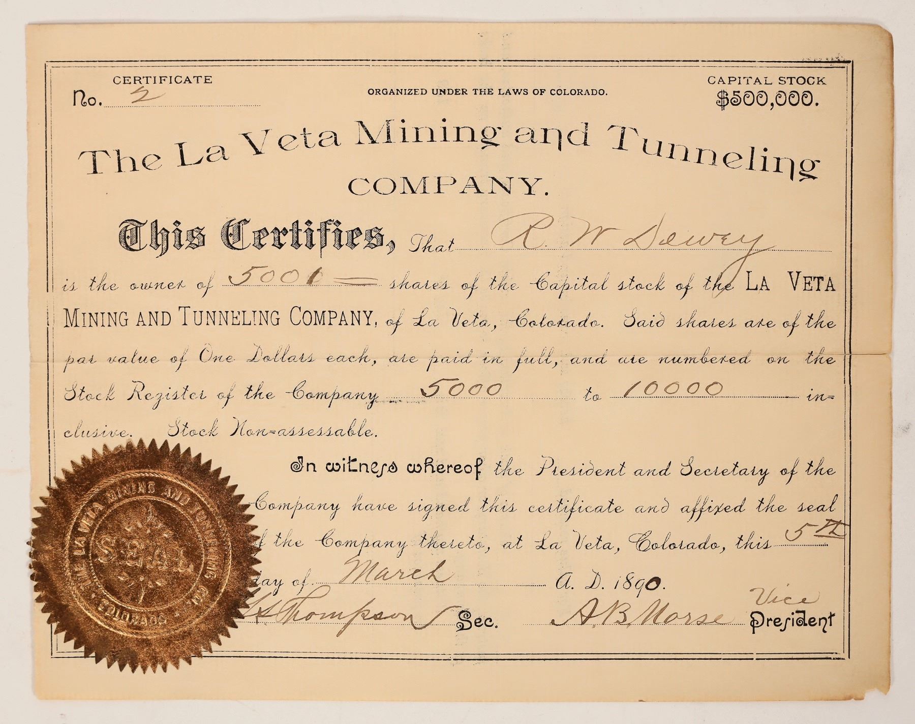 Rare issued 1890 La Veta Mining and Tunneling stock. 1.75" right horizontal tear and lower right chip. Please inspect.[ La Veta Colorado