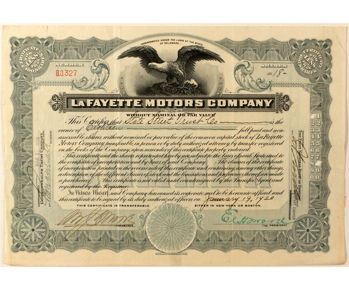 LaFayette Motors Company cert for 18 shares issued to State Street Trust. Prag Collection
