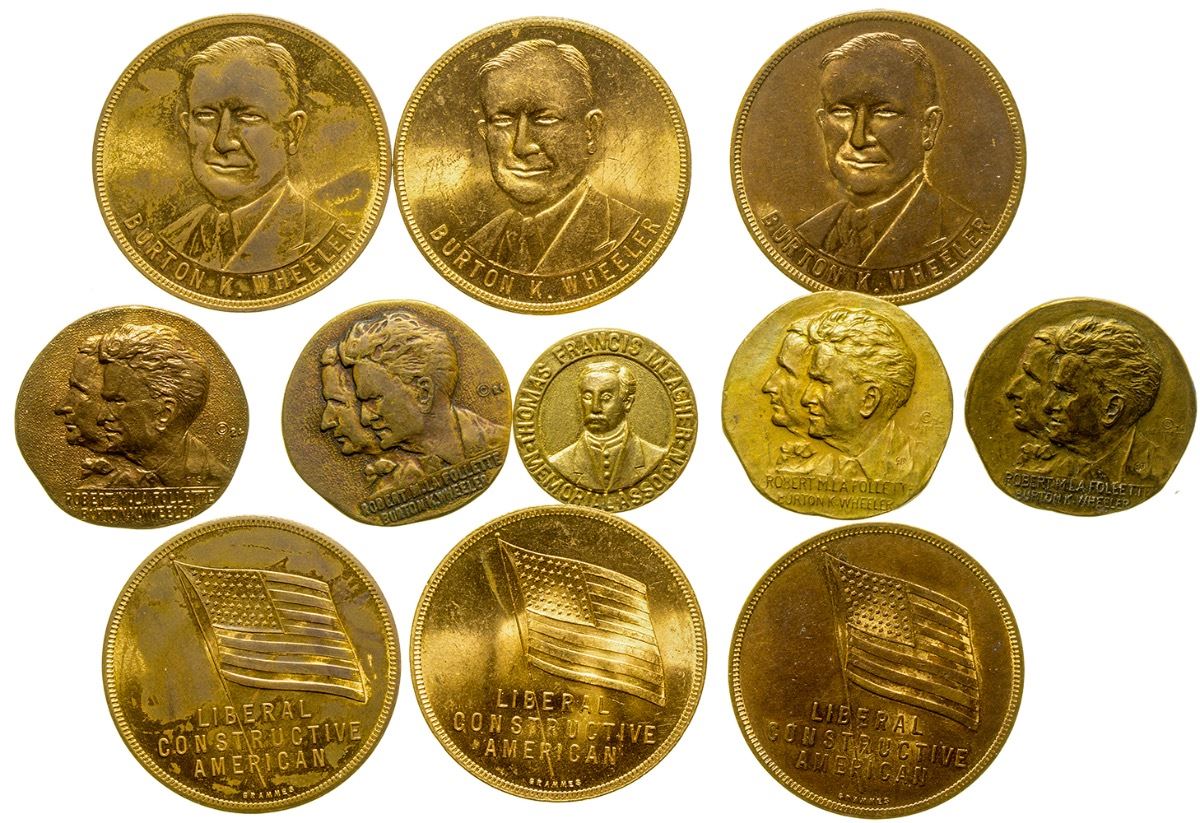 Eight pieces: three Burton K. Wheeler medals; four LaFollette & Wheeler for president and vice president pins; one button of the Thomas Francis Meagher Memorial Association. (Svoboda Collection) City: State: Montana Date: 1924 HWAC# 35178
