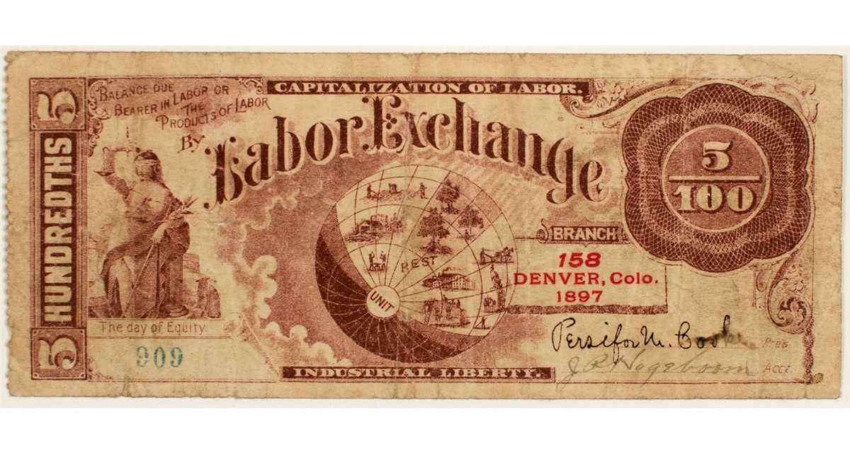 Labor Exchange Scrip for 5/100. #909. Branch No. 158, Denver, Colo., 1897. Red writing and vignette on front: "Labor Exchange" curving around a globe with "REST" on the inside. Figure on left with "The day of Equity" written beneath. Signed by Persifor U. Books as president and J.R. Nogeboom as Acct. Reverse is green writing and vignette: locomotive "Progress" approaching broken archway that says "Progress, Stop! Legal Tender Toll Gate." Men lifting sack marked "GOLD" and "SILVER." Condition: soiling and rough right edge (torn out of book?). Measures 2.5 cm x 13.3 cm. Printed on bond paper.City: DenverCounty: DenverState: CODate: