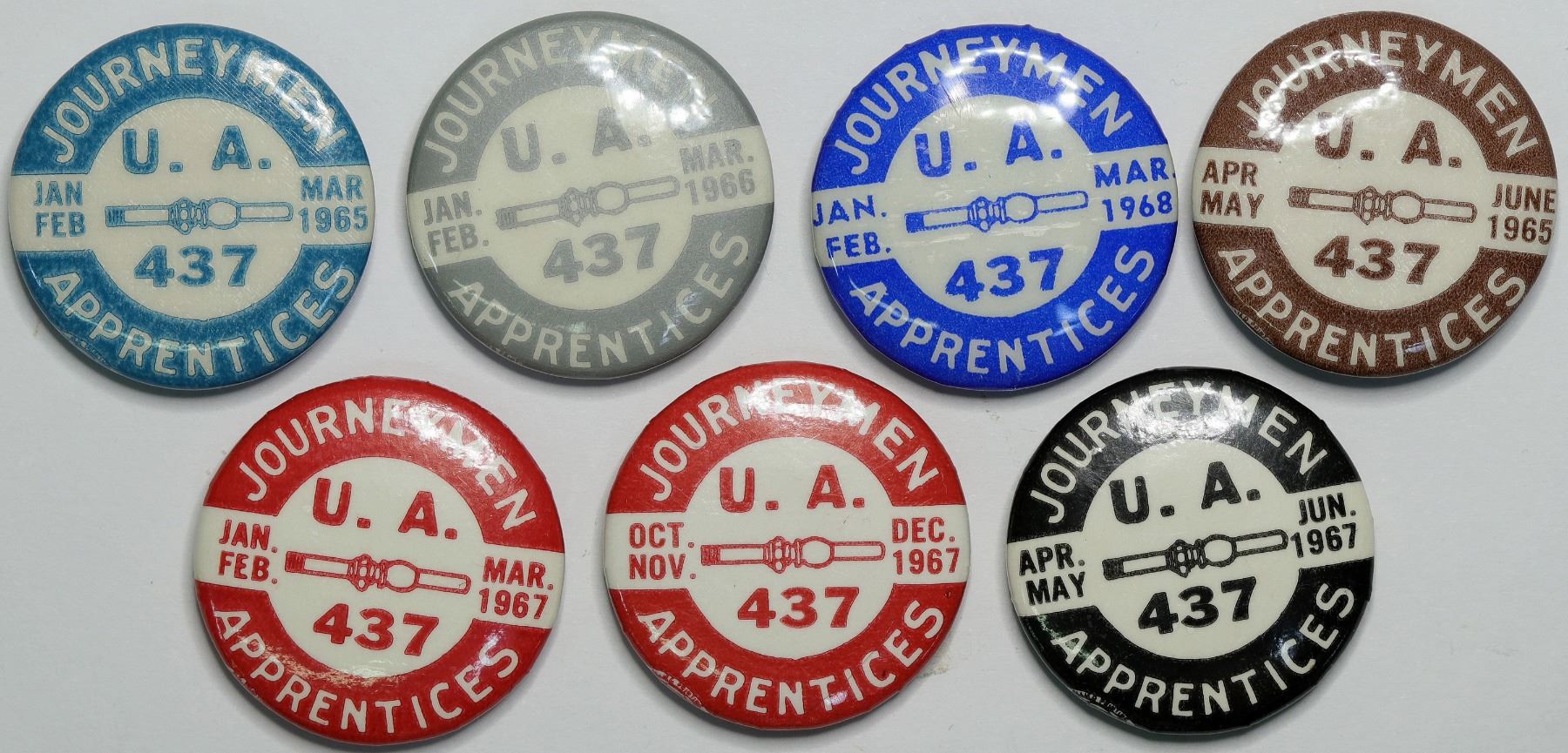 7 pinbacks. convention pinbacks of U.A. 437 Journeymen/Apprentice covering years 1965,66, 67 and '64. In January of 1920 the Plumbers and Steam Fitters were given a charter for Modesto California and became Local Union 437. In 1997, the Stockton and Modesto local unions merged into the Plumbers, Pipe and Refrigeration Fitters Local Union 442.