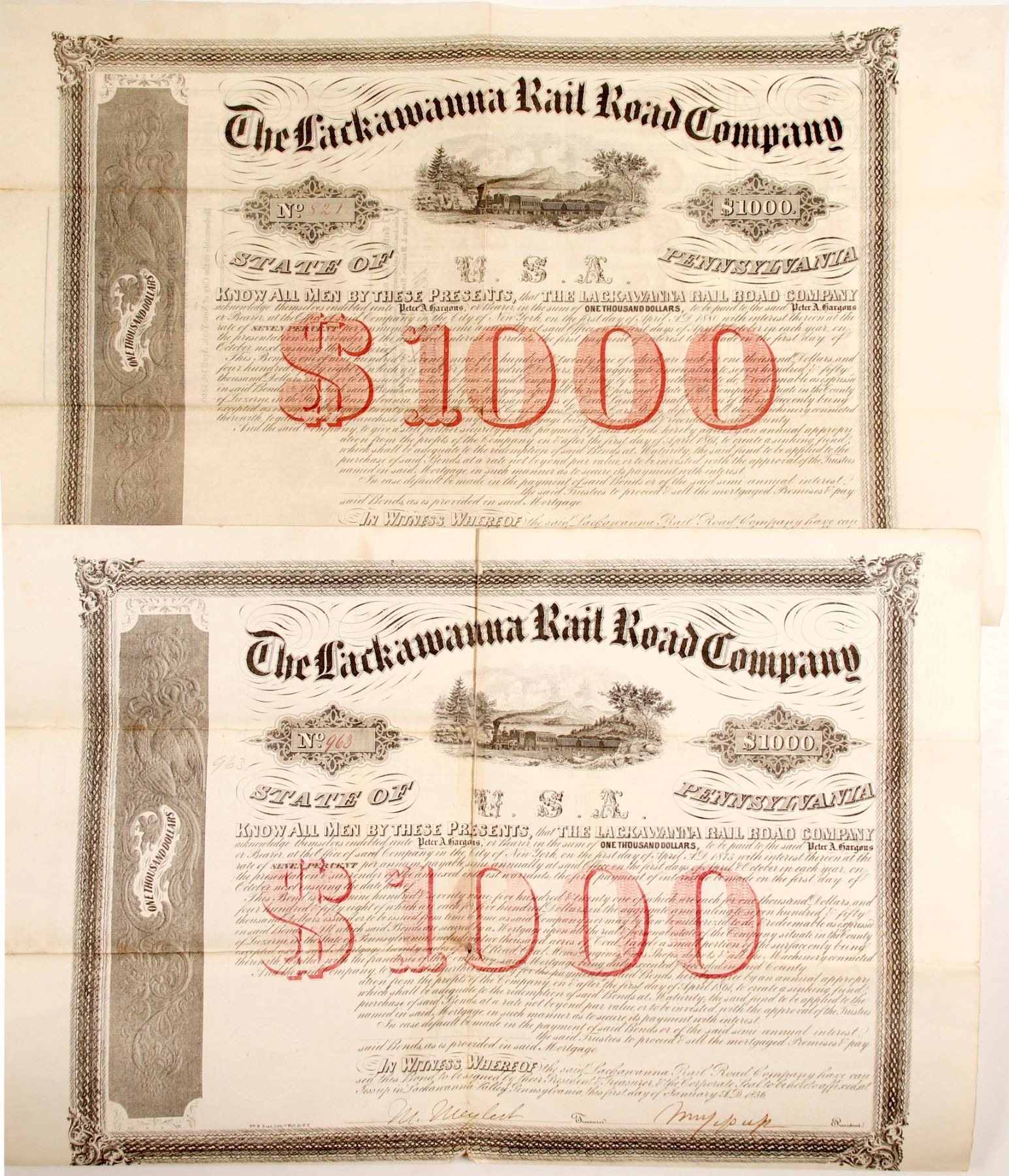 #821 $1000 red print 7% signed by President Jessup-several crease tears. Thick parchment like paper #963 $1000 red print signed by President Jessup, Wall St. printer address-rear tape repair, center hole, small cease tears. Please inspect. Ken Prag Collection