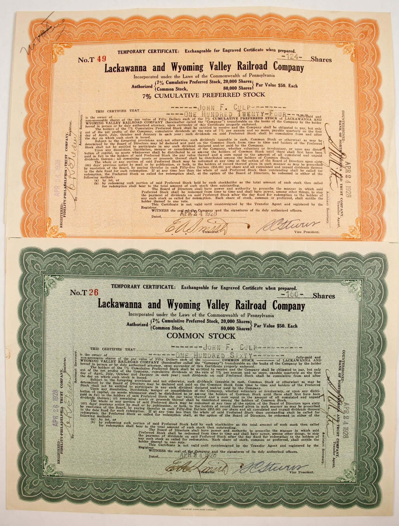 I/U #48 John Culp 124 shares signed by President Stevens. I/U # 26 John Culp 160 shares signed by President Stevens. Prag Collection State: City: Date: 1928 HWAC# 84971