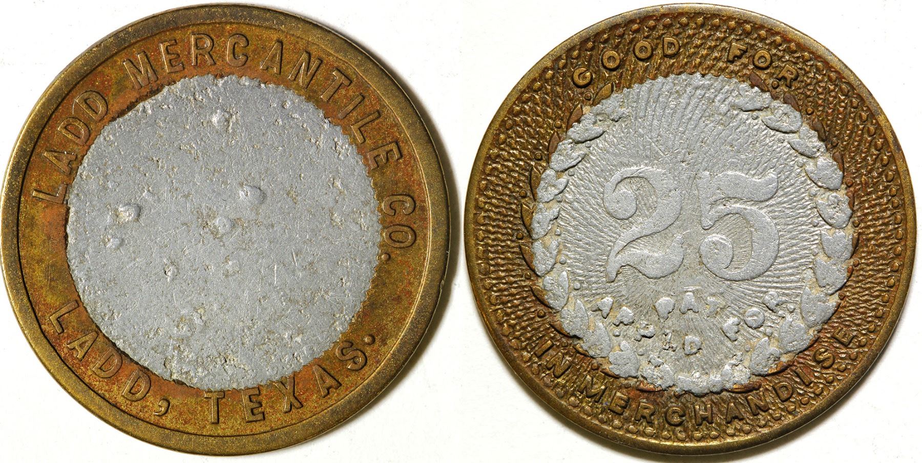 Round Aluminum 25 mm, LADD MERCANTILE CO./ LADD TEXAS// GF/25 C/IM. Rare token, tough Texas town. HWAC# 62514 Date: Location: Ladd, Texas