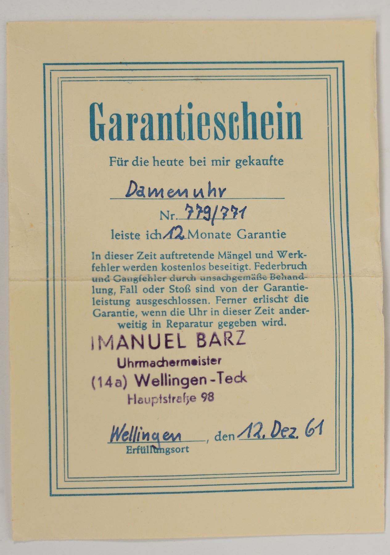 14k Gold Ladies antique pocket watch. 1961. Winds and ticks but minute hand is detached from center. Reverse reads: Walzgold Double / 20 mikron / 10 jahre. Comes with original case and guaranty card. "Garantieschein" with watchmaker's information: Imanuel Barz. 22.7 grams.