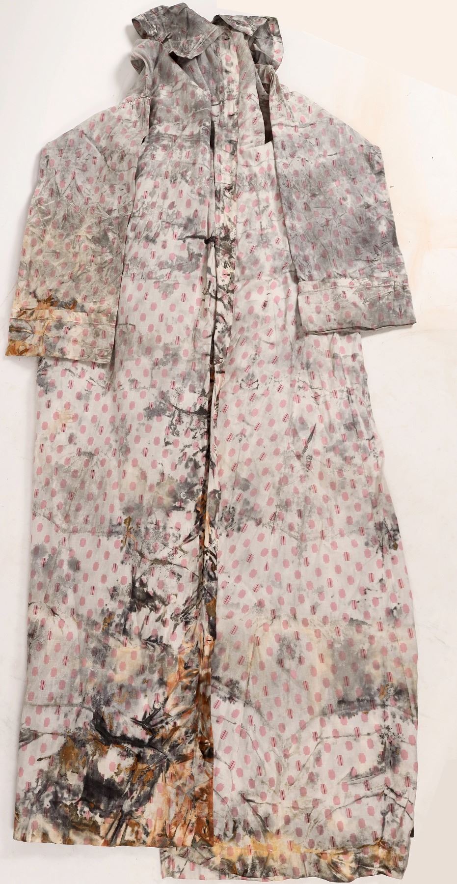 Ladies clothing recovered from the Easton trunk found at the S.S. Central America shipwreck. 1.) A woman's large dressing gown with two different pink patterns, all about 1/2 x 3/4 inch at regular intervals. 4" collar, 3" cuff. Pleated back along chest line with two 32" ties. Long Sleeve, 52" long. Generally good condition. 2.) Gold silk scarf, thin lined edges, small pink fish hook patterns with pink floral pattern in one corner. 26 x 26" significant degradation. Copper and black residue in one area, possibly the result of having something wrapped in the scarf that contained copper, such as a coin or brooch. 3.) Ladies crotchless bloomers (open 14" in crotch area), single button closure at waist. Floral pattern 2" lace along the bottom of the legs. Overall length 35", apparent waist 22". White material, generally fine except stain.