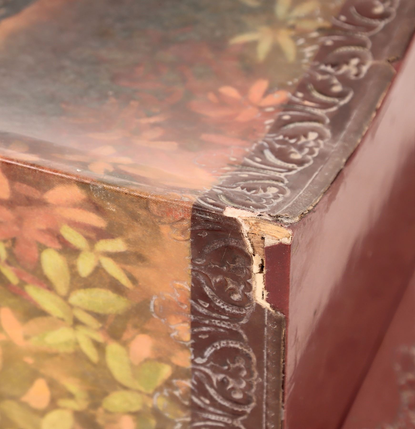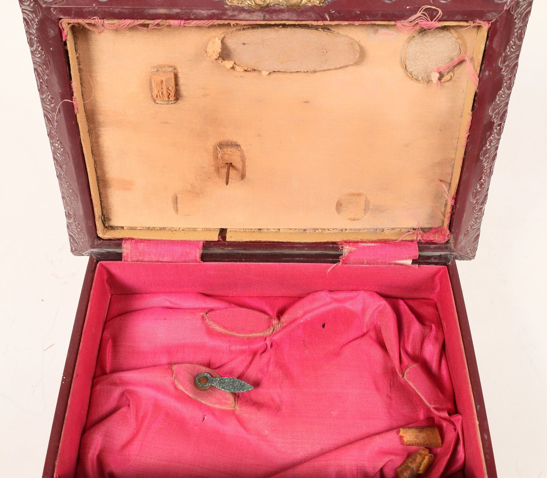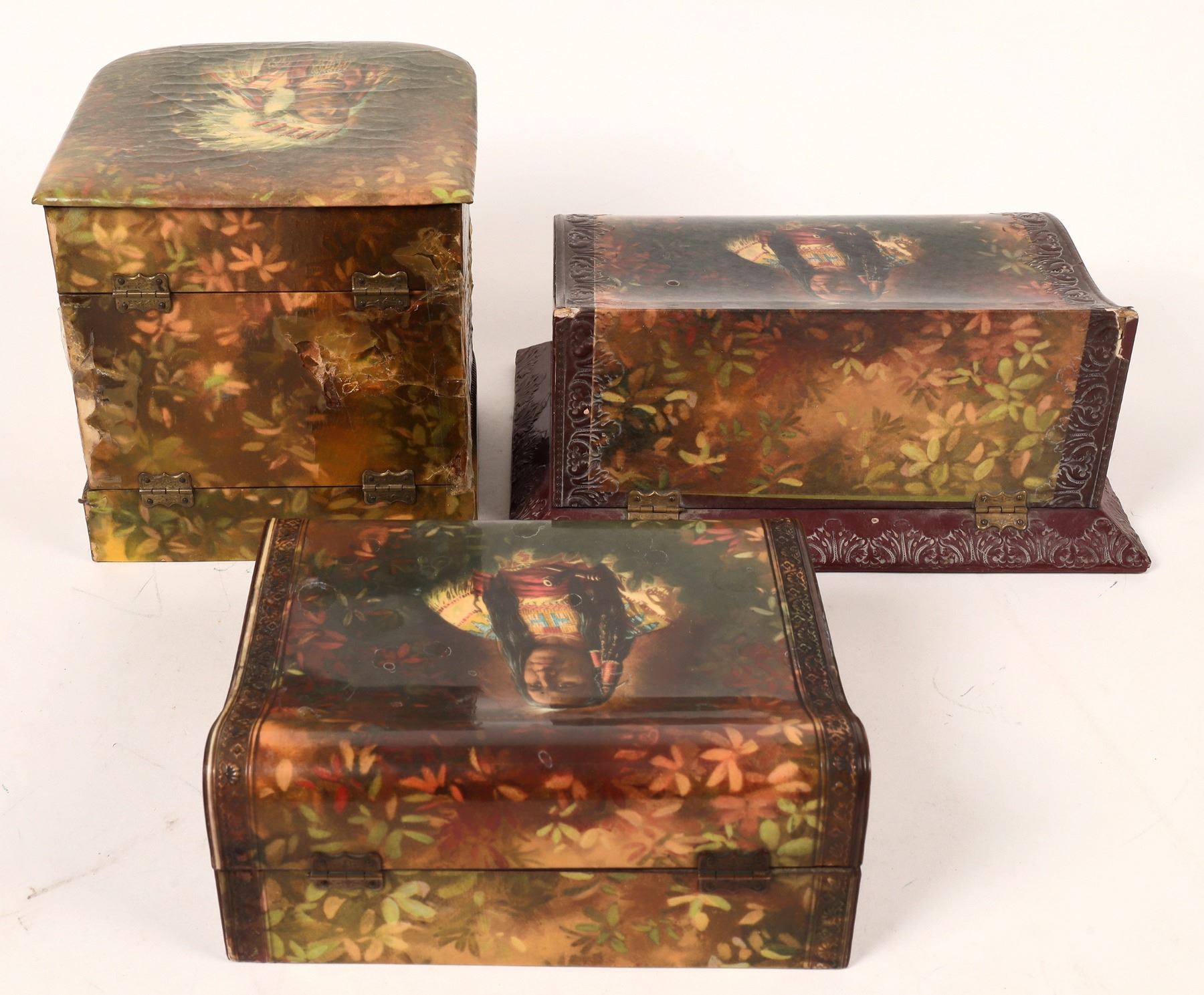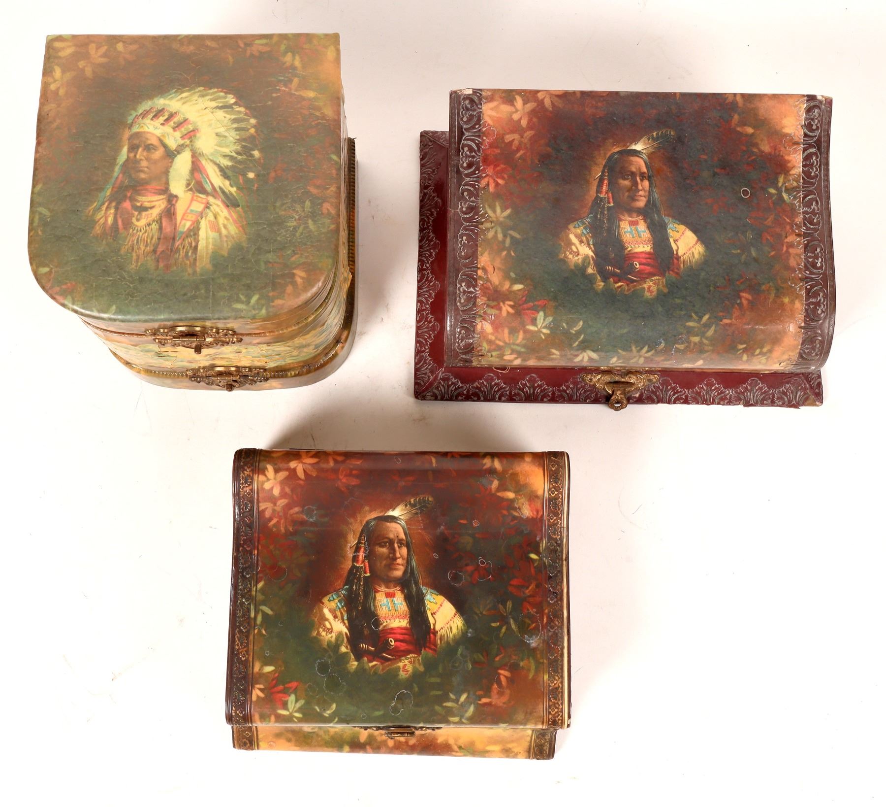 Jewelry boxes (3) with American Indian theme design. One is for men to keep their celluloid collars (included) along with cufflinks and tie pins. It is decorated in a clousinet-like style, showing an Indian Chief (Measures 6"x 6" The other two, one measuring 6"x 7" the other measuring 6"x 9". One needs replacement lining. Very nice pieces. Please see photos for more detail. 1900s
