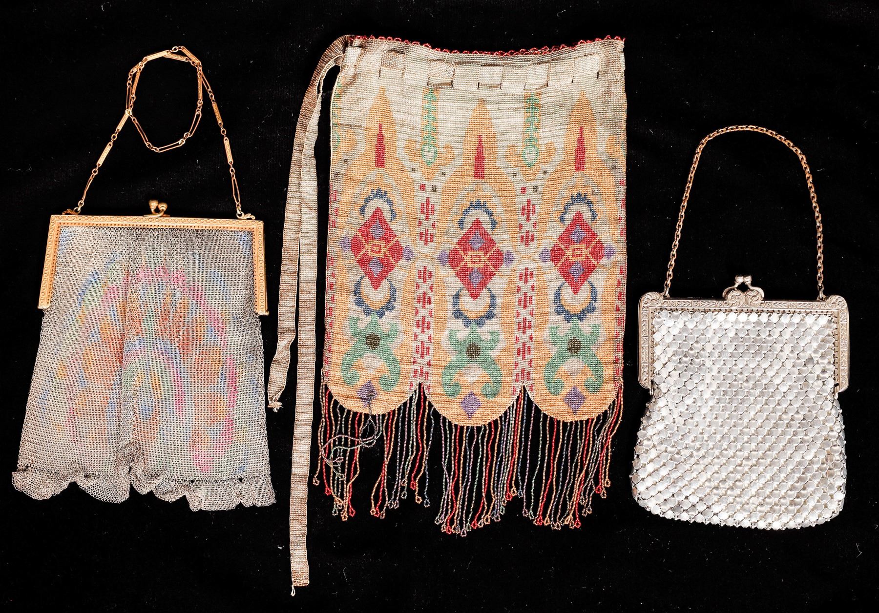 3 vintage ladies purses. Blingy white metal, 5.25x4.25". Colored mesh 6.5x4.75". Colorful beaded, 7.75x6.25".