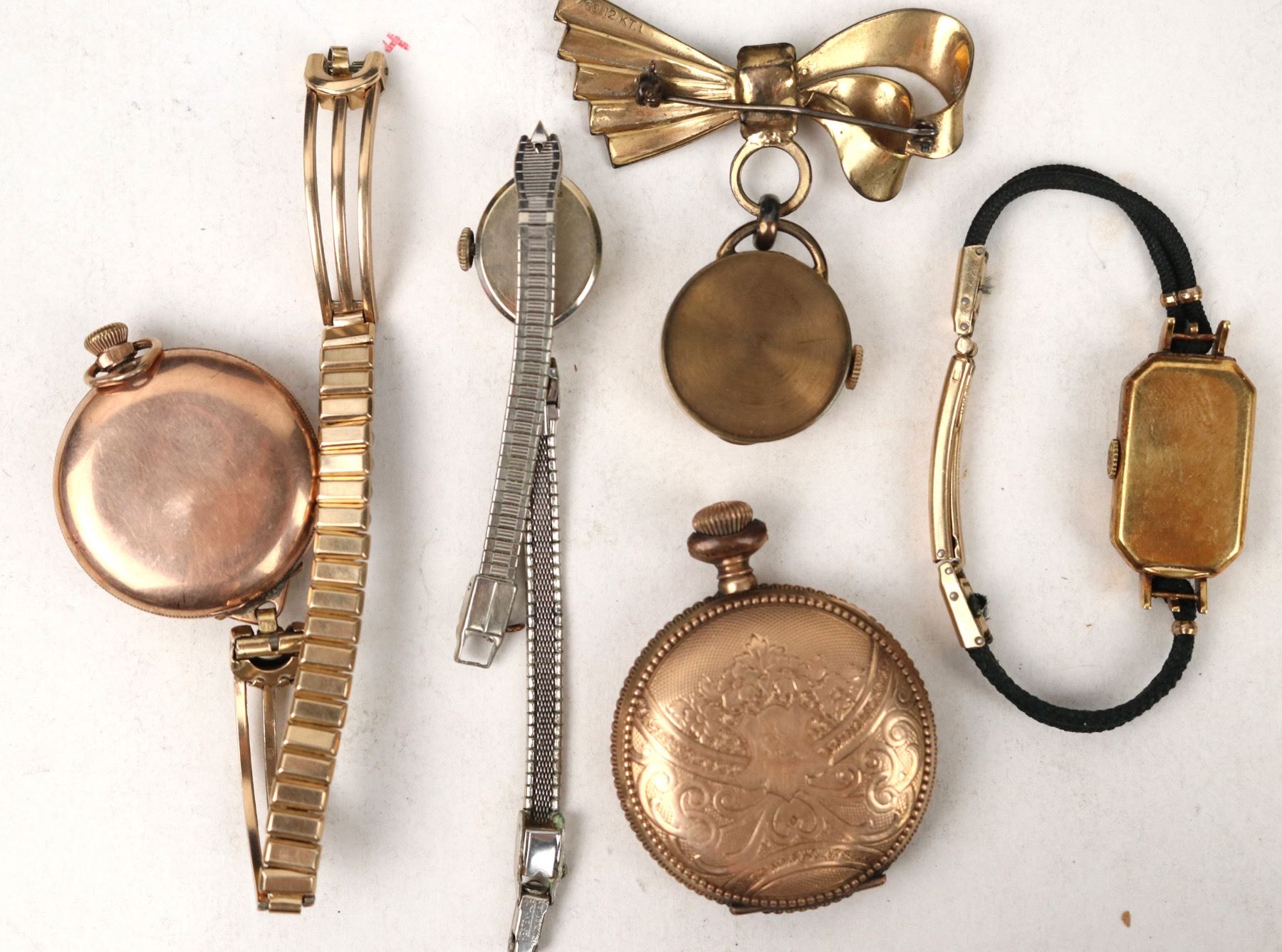 Lot of five items: four watches: Hampden pendant watch, Waltham wrist watch; Wyco breast pin watch; a vintage wrist watch, whose maker has faded with time. Also a gold toned watch case engraved "B H"; no watch.