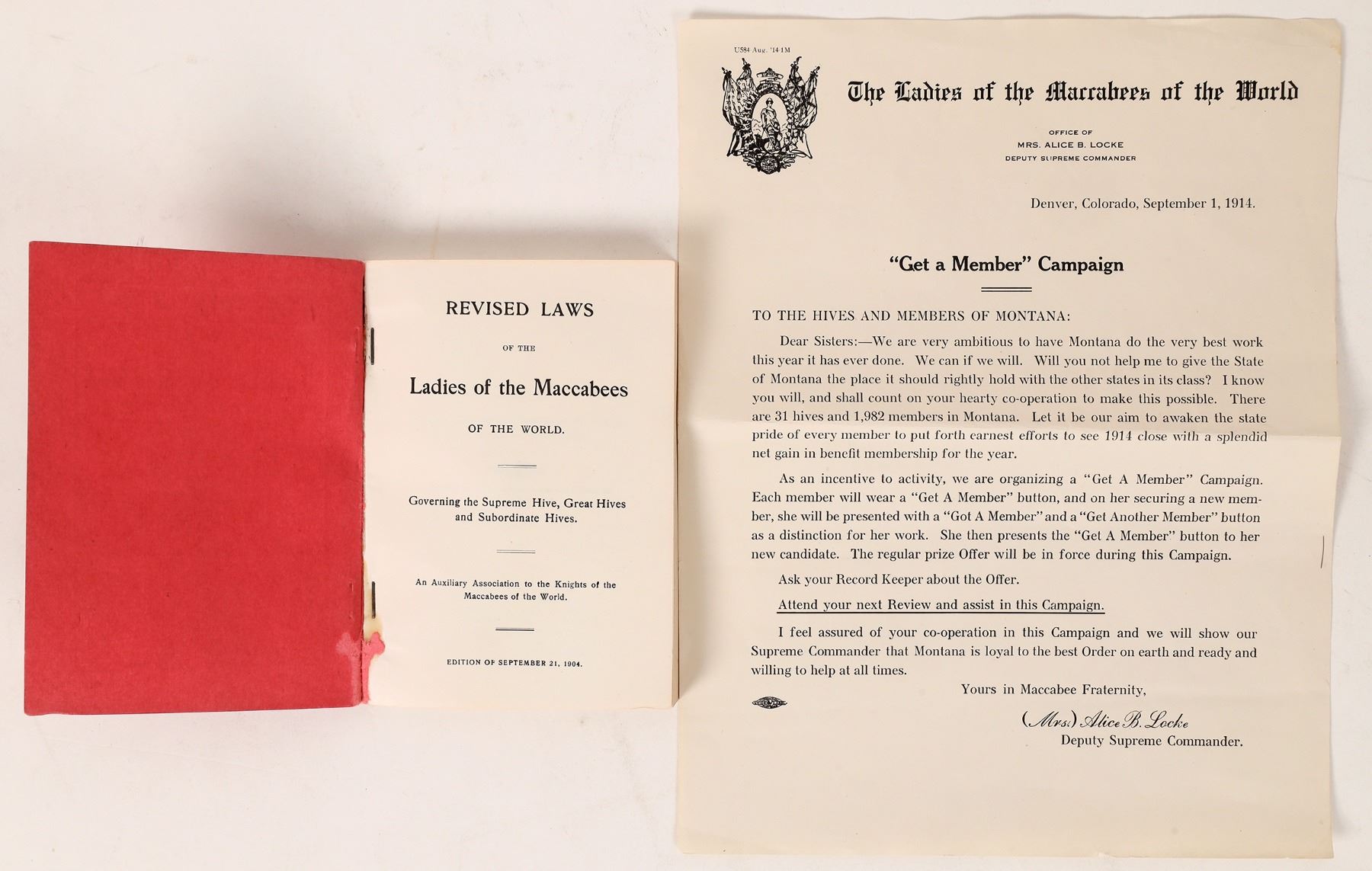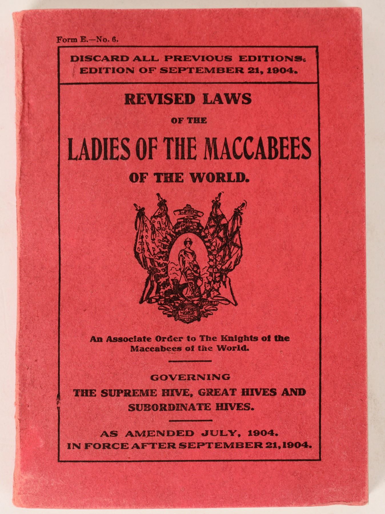 A Ladies of the Maccabees revised laws softcover book. The fraternal organization was founded in 1886. The book is in nice condition. Please see photos for more details. Colorado Dener 1914