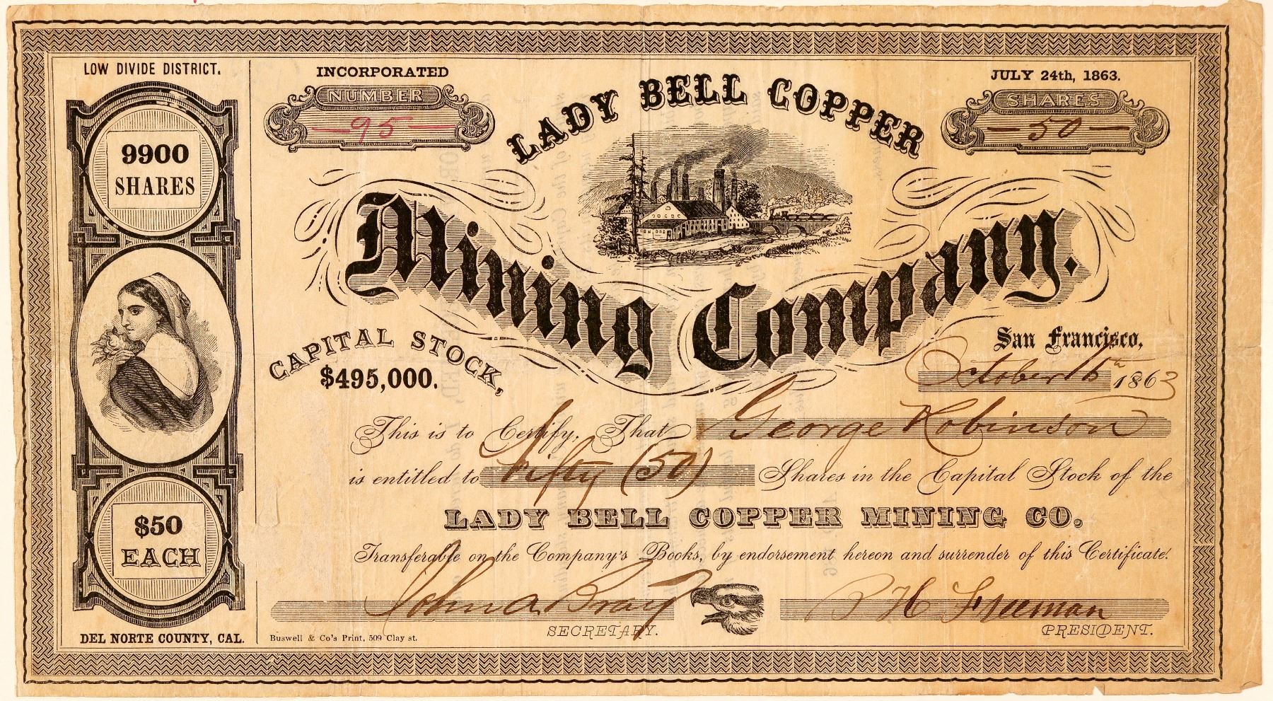 Low Divide District, Del Norte County, Cal. (printed on the top and bottom left). Inc. July 24th, 1863. No. 95, issued for 50 shares to George Robinson on Oct. 15th, 1863 in San Francisco. Signed by president BH Freeman and secretary John A. Bray. Not cancelled. Black border and print. Vignette of woman (left), eagle head (bottom center), and mine (top center). Printed by Buswell & Co. Folds, creases, heavy toning. 5.25 x 9.75" Not in Filer or Holabird indexes. Mentioned in a Daily Alta California Sept. 24, 1864 report of the Del Norte Mines. The author visits the site of the Lady Bell, near the north fork of the Smith River. "This is quite an important location, from the magnitude of the undertaking to open the mine, and the fact that the ground embraces two distinct veins— one 600 feet from the mouth of the tunnel, the other 1,600... Both veins seem reliable. Hence, the first will be cut at 600 feet below the surface; the second at 900." State: California City: Del Norte County Date: 1863